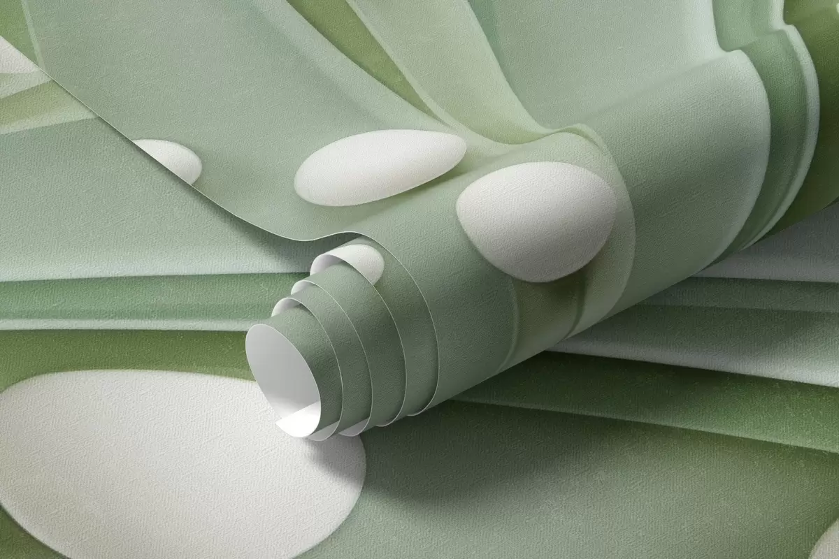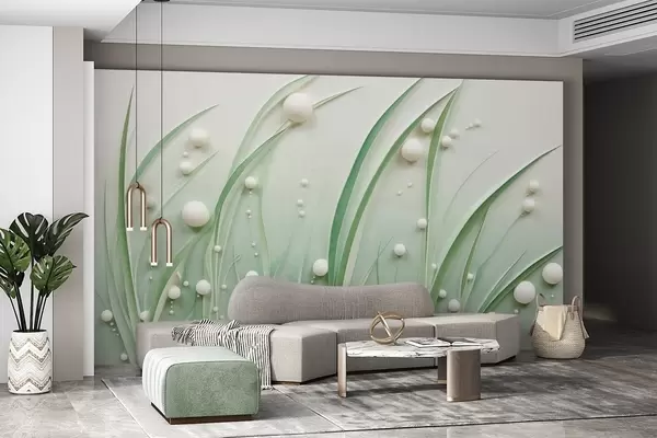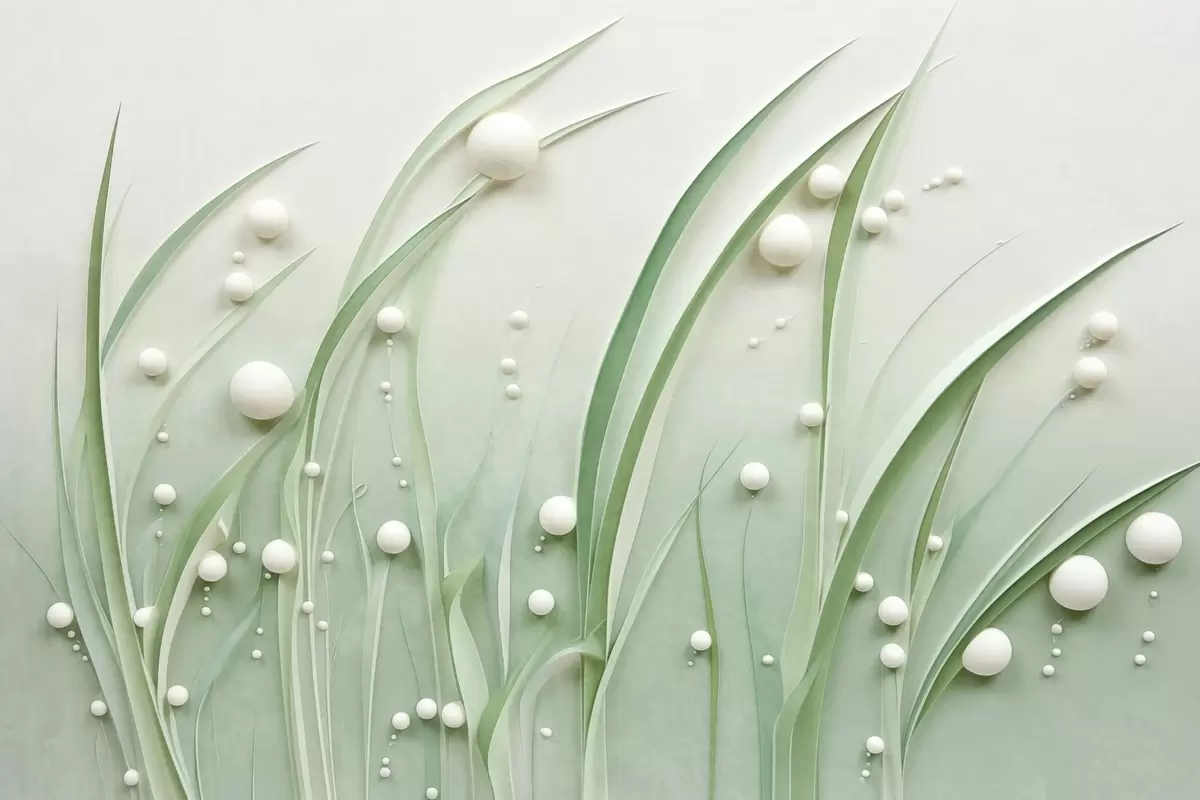 Zidne murale Apstraktna zelena trava s bijelim kuglama, svijetlozelena pozadina, tekstura, čiste linije, minimalistički stil br. w09382