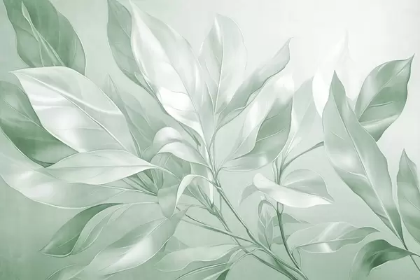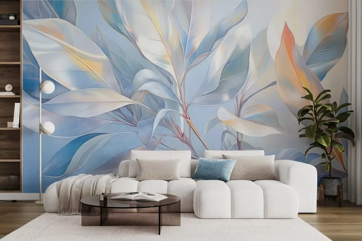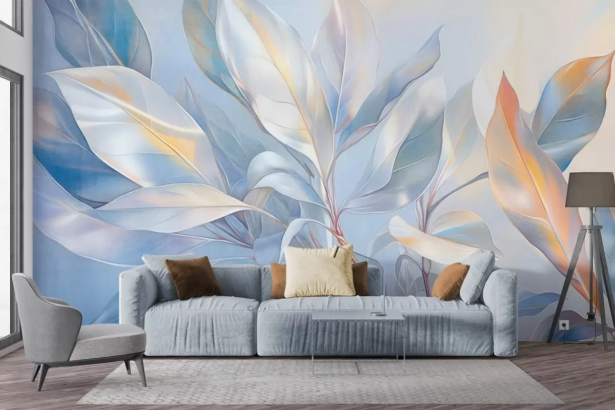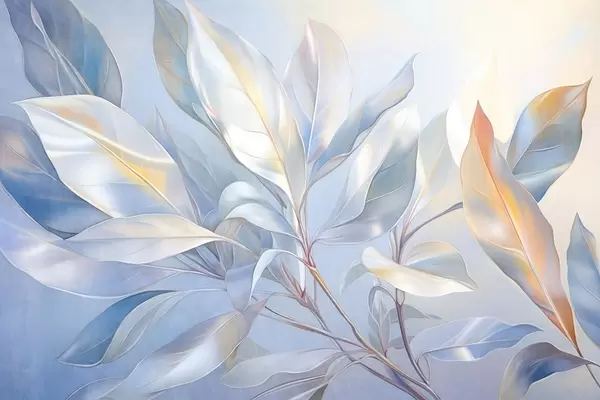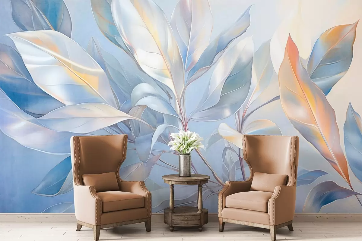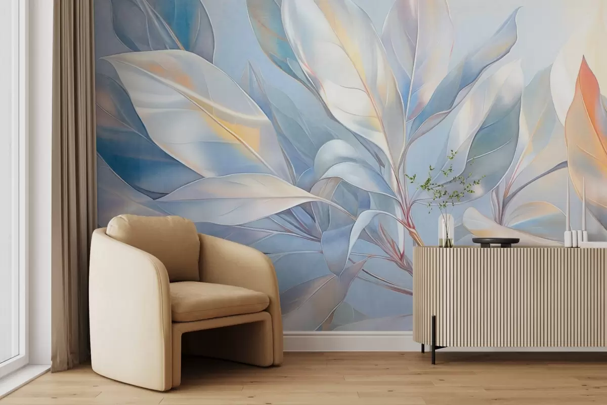 Zidne murale Listovi magnolije s bijelim i plavim tonovima, meko osvjetljenje, elegantna kompozicija, detaljne žile lista, umjetnički potezi kistom br. w09385