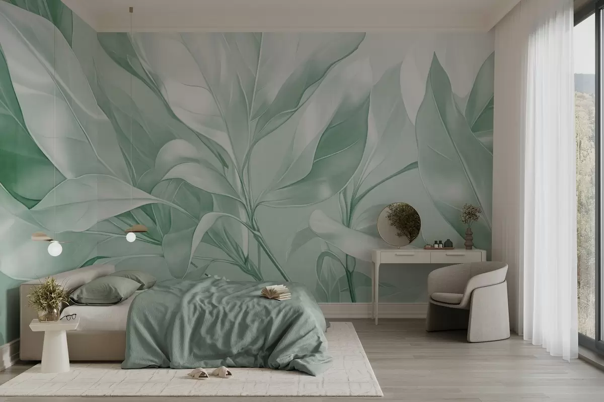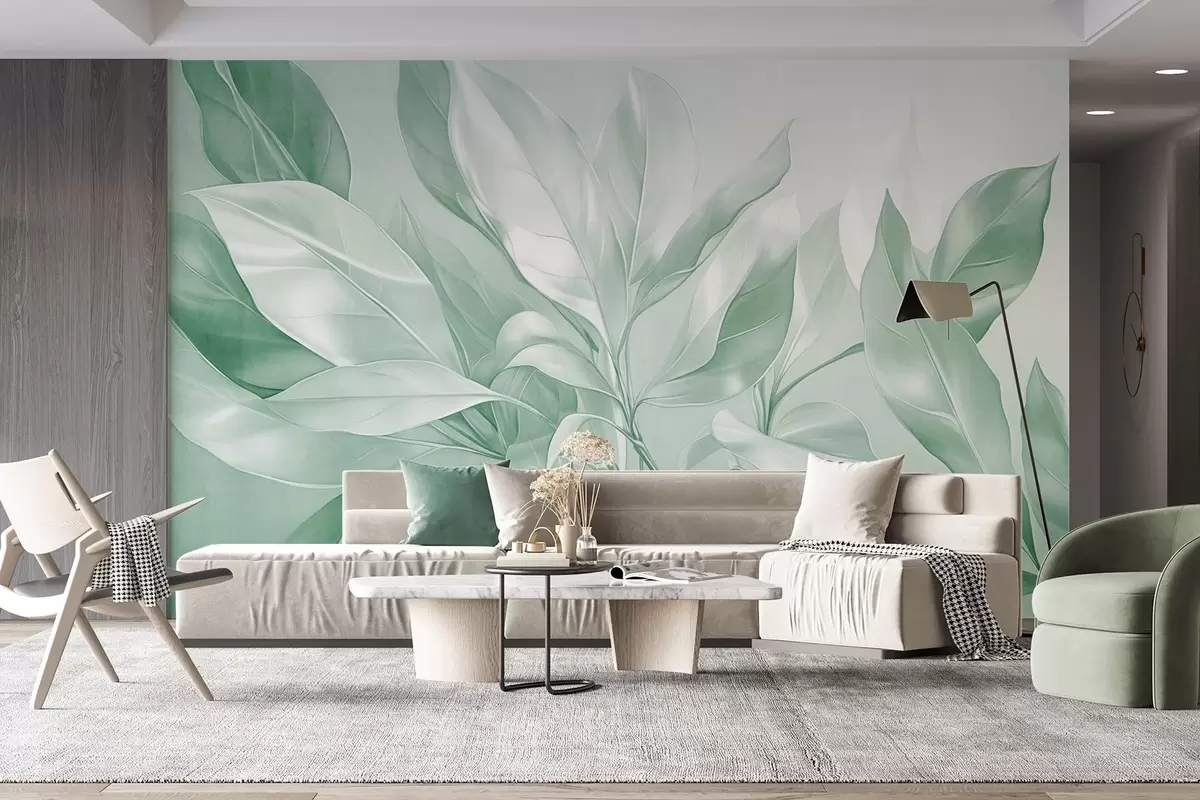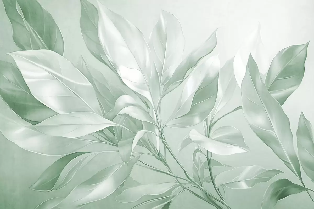 Zidne murale Listovi magnolije s bijelim i zelenim tonovima, meko osvjetljenje, elegantna kompozicija, detaljne žile lista, umjetnički potezi kistom br. w09385v1