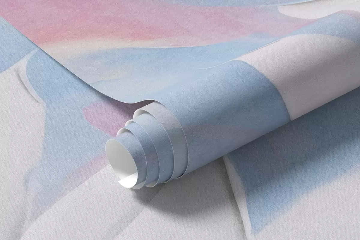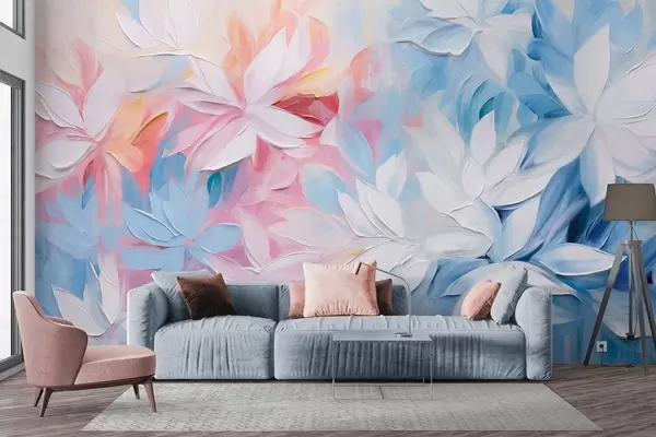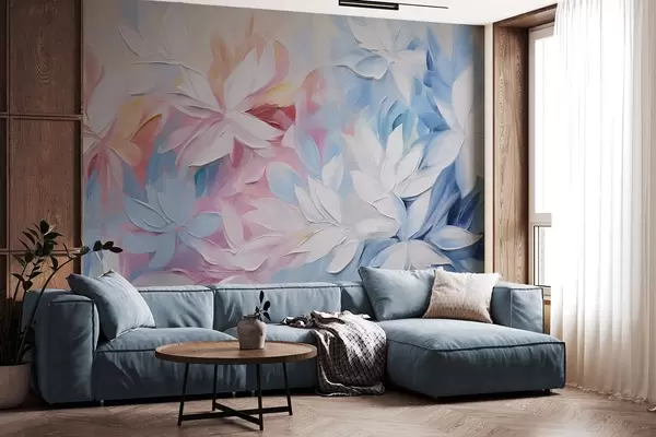 Zidne murale Bijelo teksturirano cvijeće s ružičastim i plavim lišćem, apstraktni stil uljane slike, meki potezi kistom, pastelne boje br. w09396