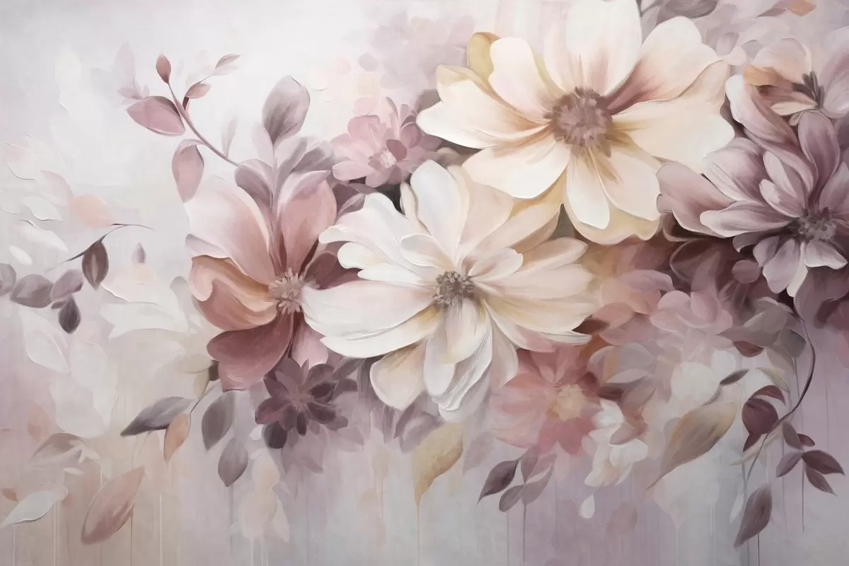 Zidne murale Cvjetni aranžman s velikim teksturiranim cvjetovima nježnih boja u nijansama bordo, breskve i bijele, s nježnim listovima br. w09398