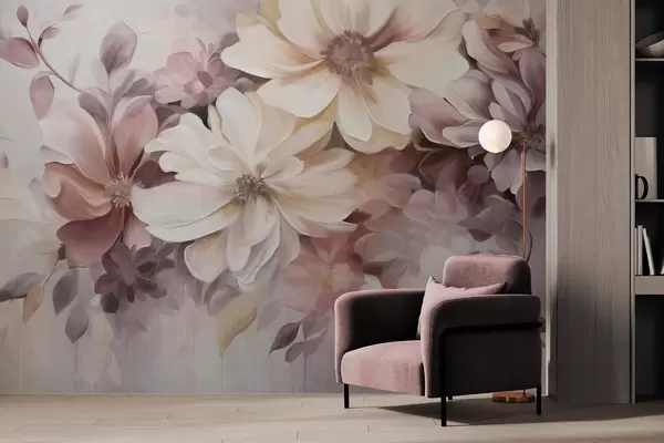 Zidne murale Cvjetni aranžman s velikim teksturiranim cvjetovima nježnih boja u nijansama bordo, breskve i bijele, s nježnim listovima br. w09398