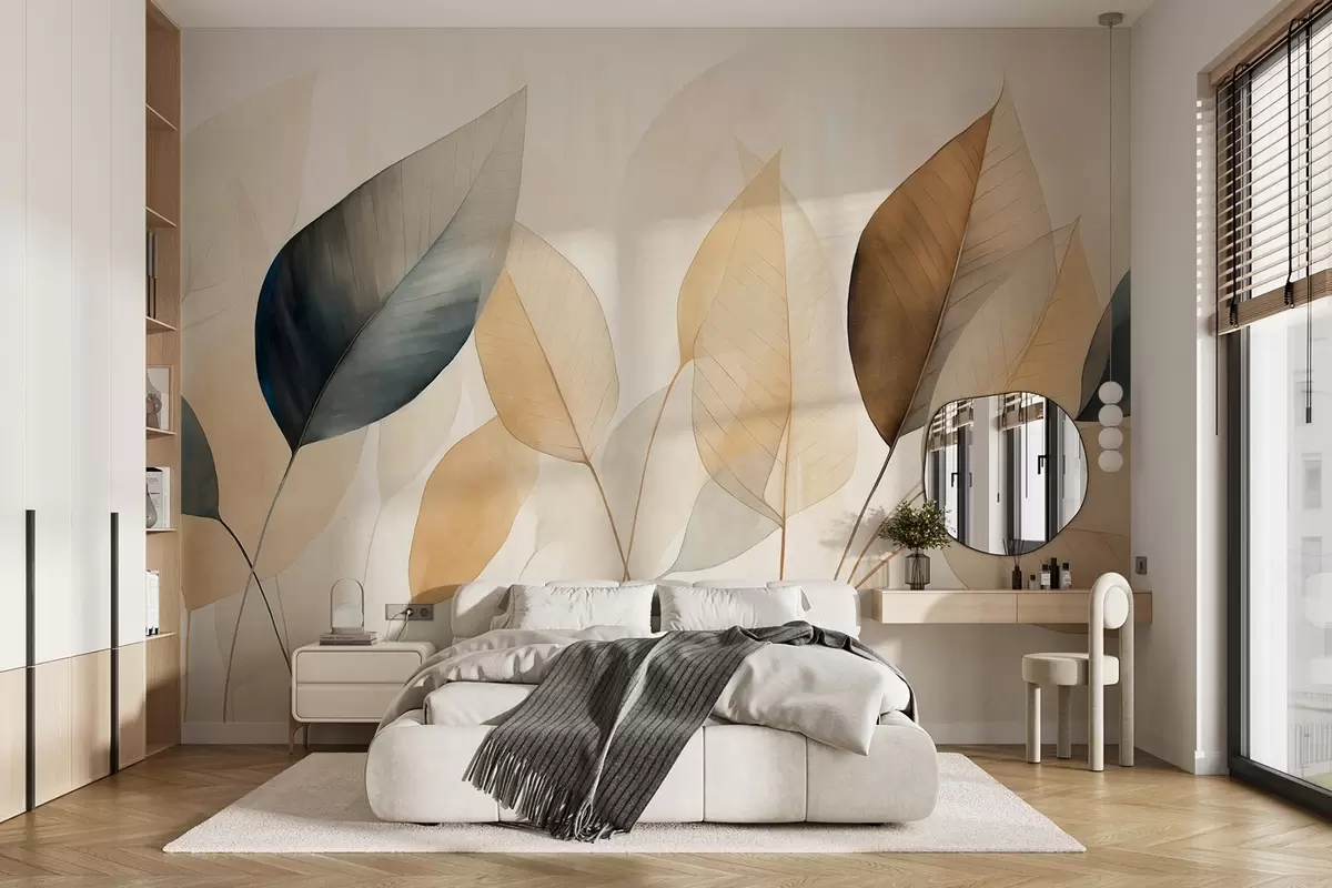 Zidne murale Teksturirana imitacija lišća u nijansama smeđe, žute i sive, s nježnim žilama i stabljikama br. w09400