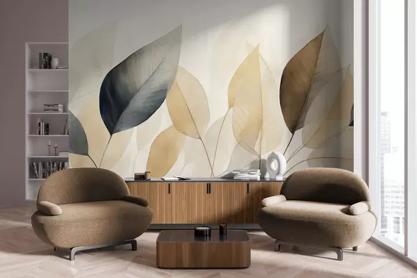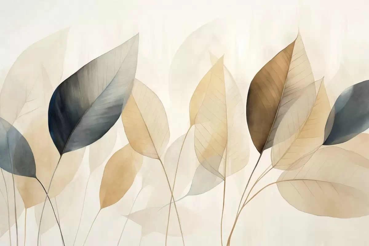 Zidne murale Teksturirana imitacija lišća u nijansama smeđe, žute i sive, s nježnim žilama i stabljikama br. w09400