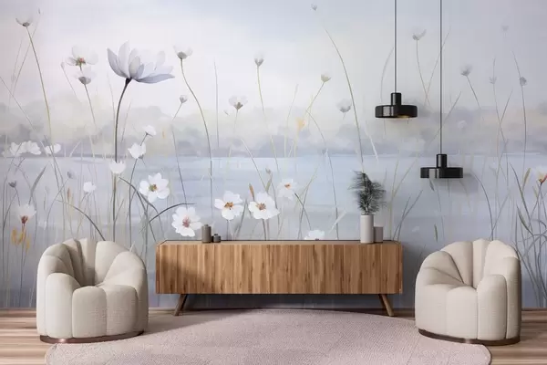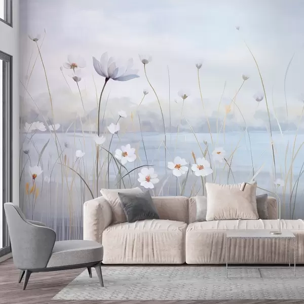 Zidne murale Bijelo cvijeće s dugim stabljikama u polju, svijetloplavo nebo, meke boje, teksturirano, minimalistički stil, inspirirano prirodom, mirna pozadina br. w09401