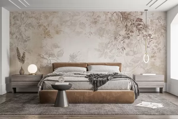 Zidne murale Vintage teksturirana cvjetna umjetnost s ilustracijama nježnog vrtnog cvijeća i lišća u stilu crtanja, mekim pastelnim bež i sepia tonovima br. w09402