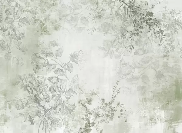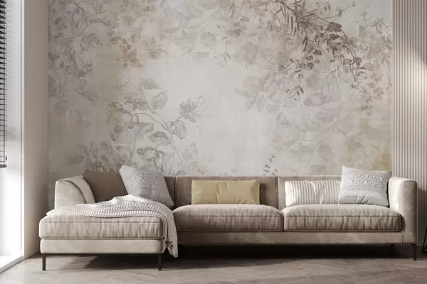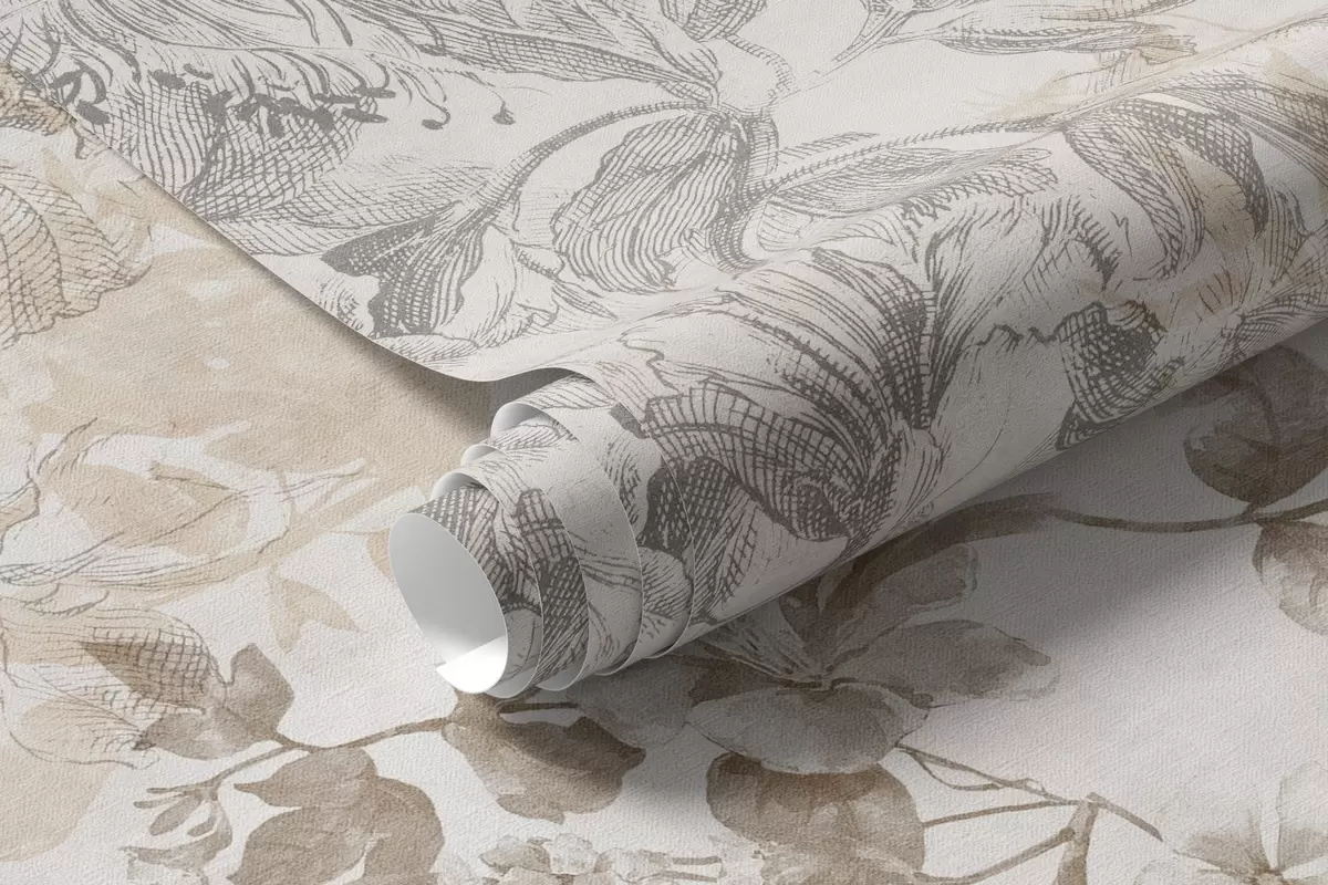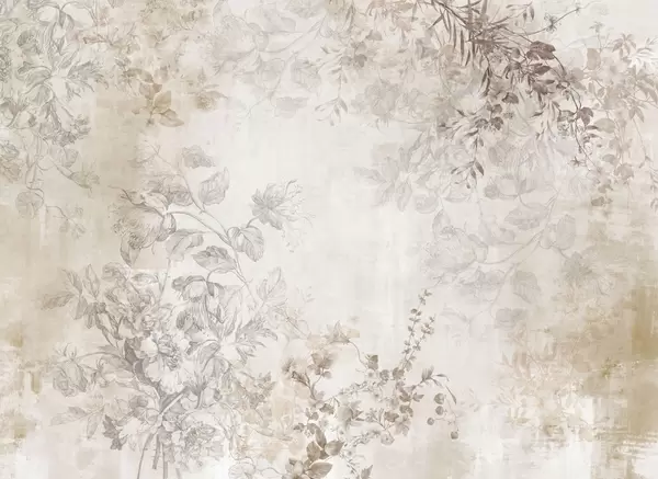 Zidne murale Vintage teksturirana cvjetna umjetnost s ilustracijama nježnog vrtnog cvijeća i lišća u stilu crtanja, mekim pastelnim bež i sepia tonovima br. w09402