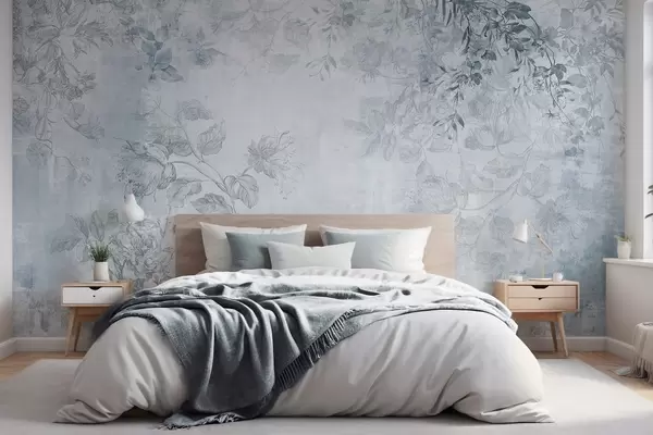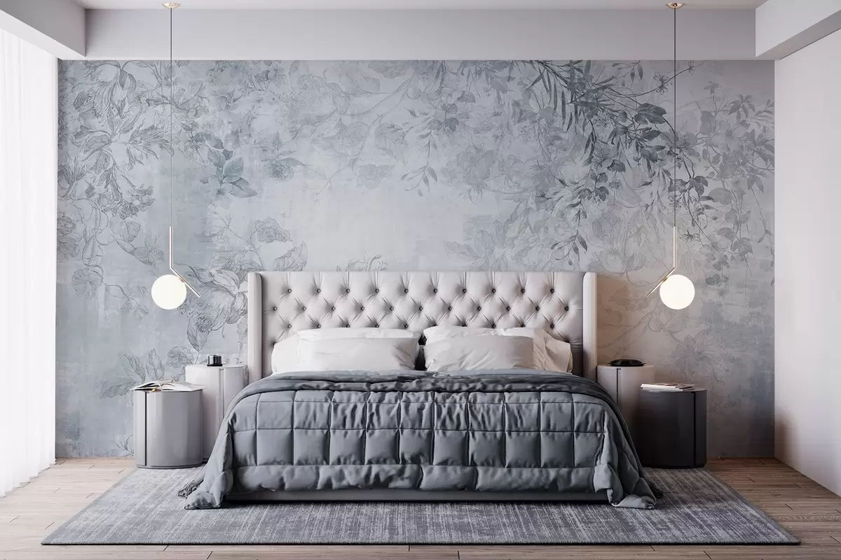 zidne murale Vintage teksturirana cvjetna umjetnost s ilustracijama nježnog vrtnog cvijeća i lišća u stilu crtanja, meki plavi tonovi w09402v1