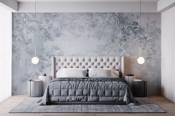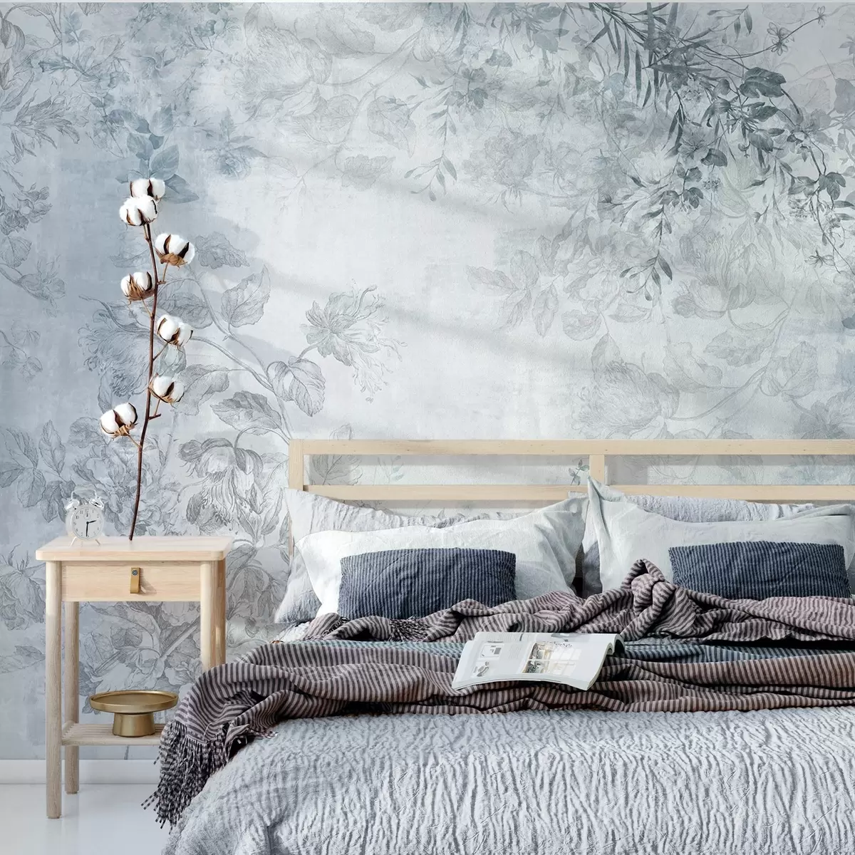 Zidne murale Vintage teksturirana cvjetna umjetnost s ilustracijama nježnog vrtnog cvijeća i lišća u stilu crtanja, meki plavi tonovi br. w09402v1