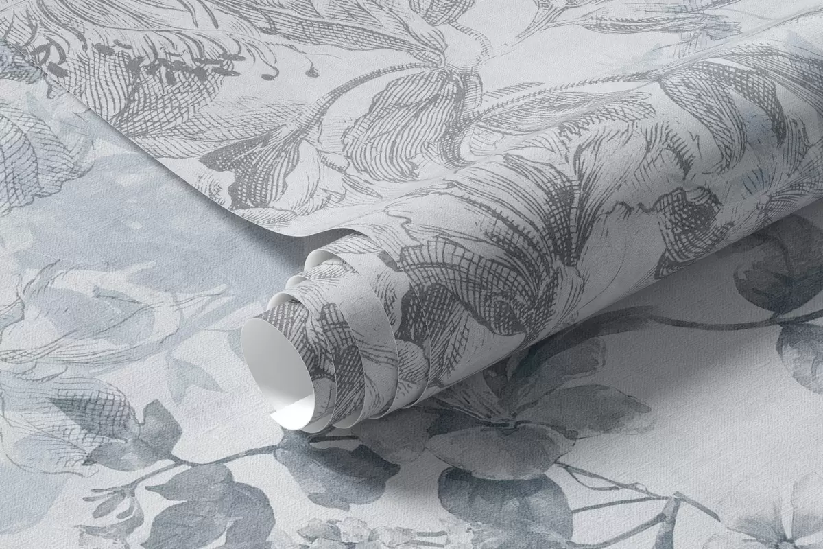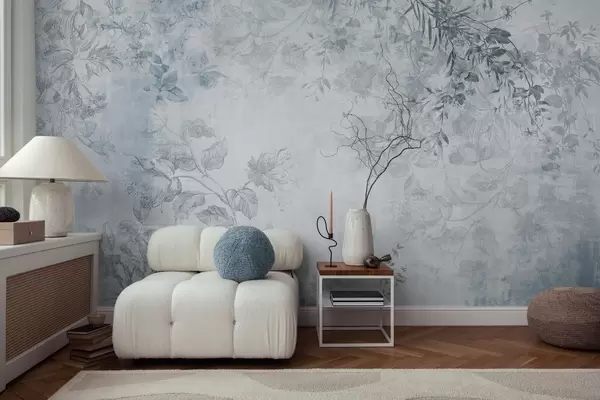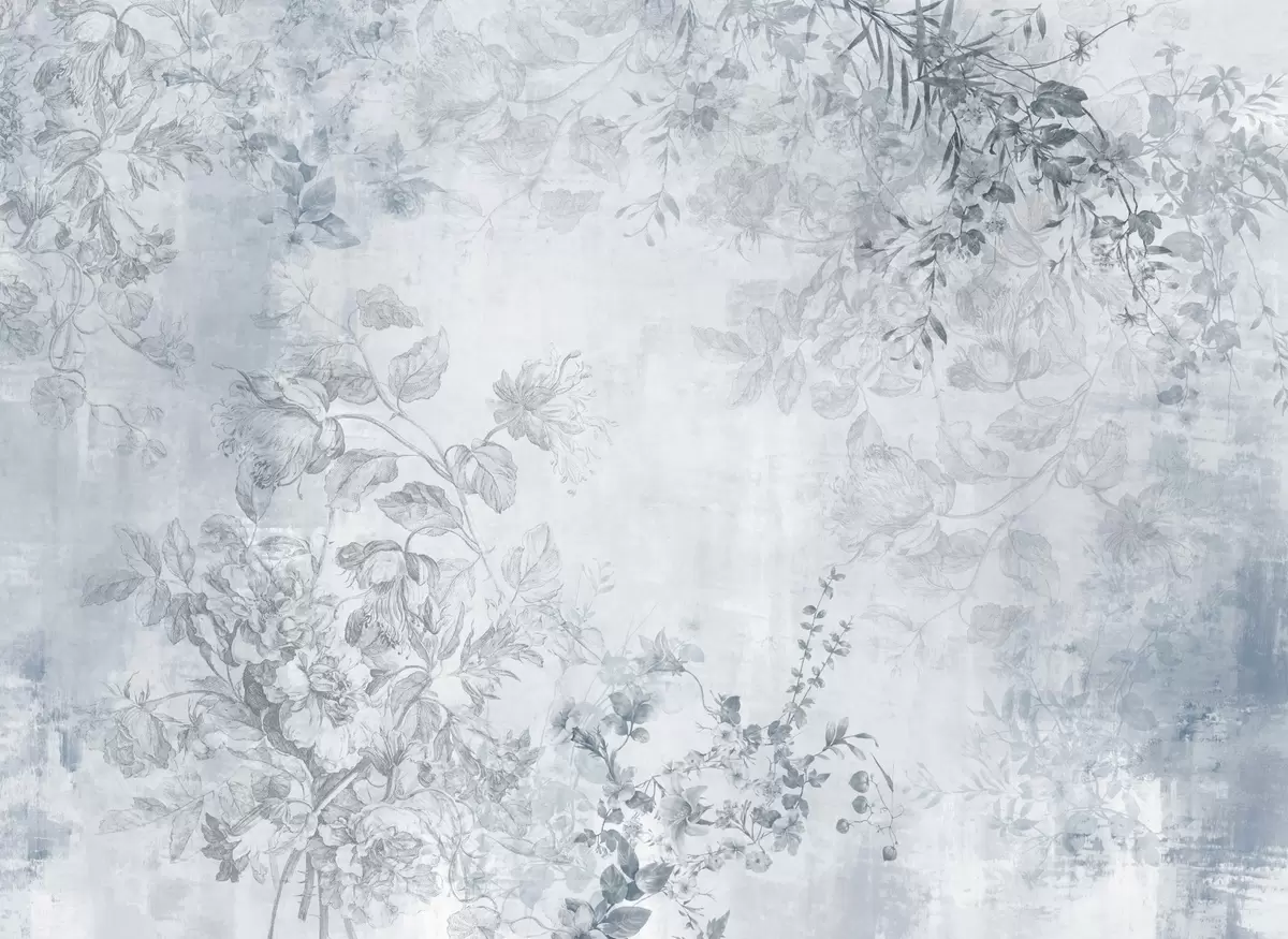 Zidne murale Vintage teksturirana cvjetna umjetnost s ilustracijama nježnog vrtnog cvijeća i lišća u stilu crtanja, meki plavi tonovi br. w09402v1