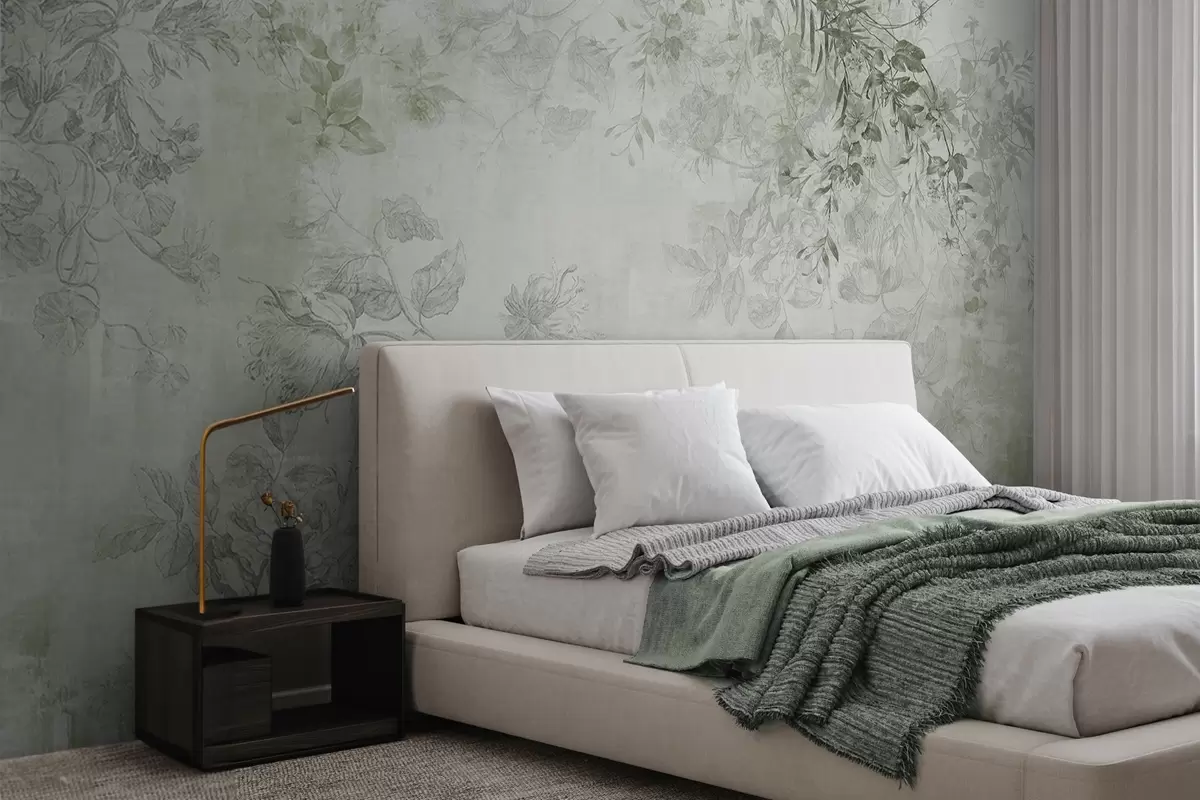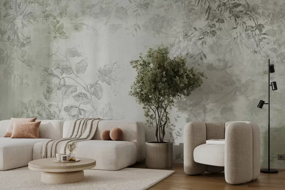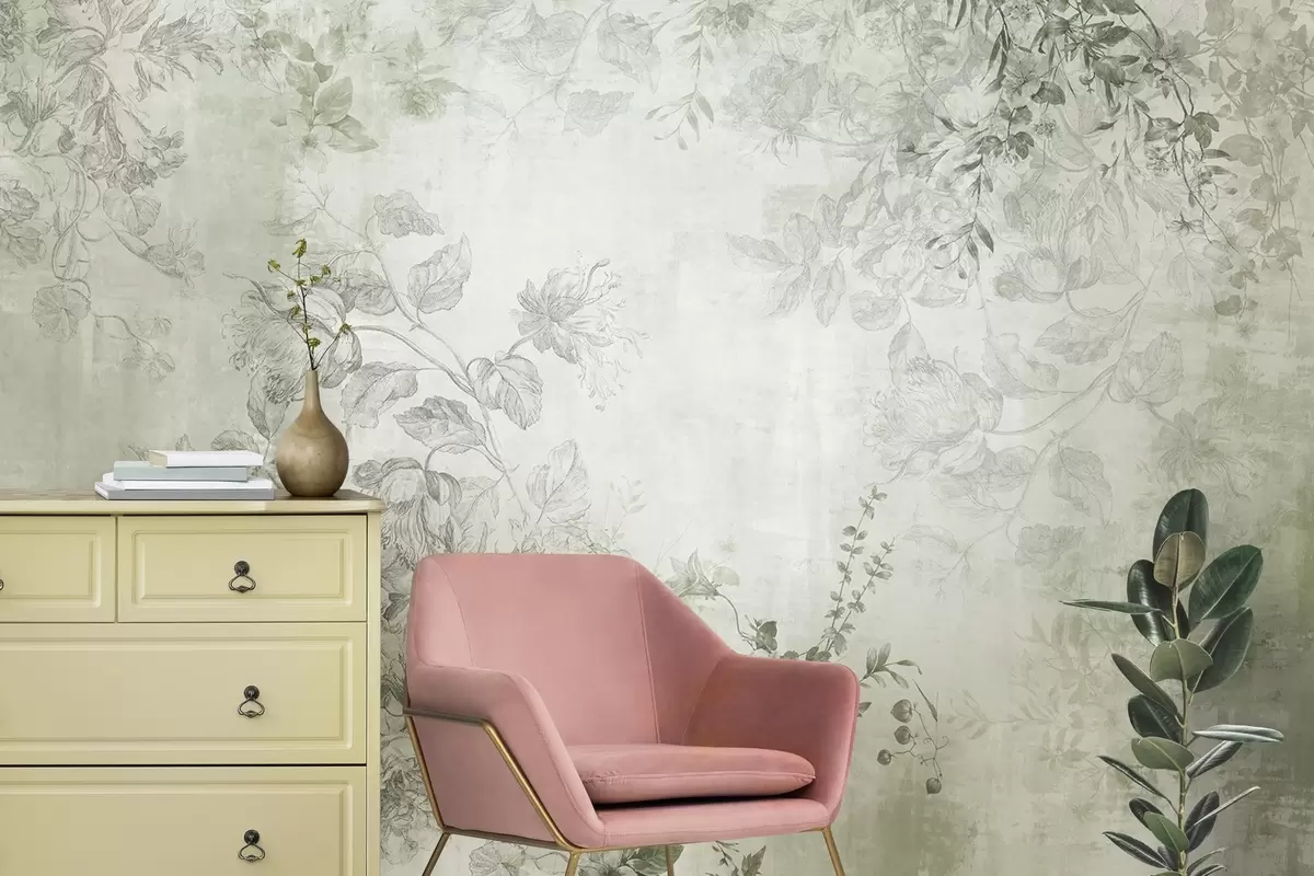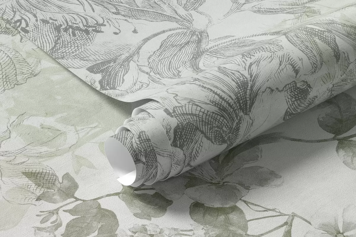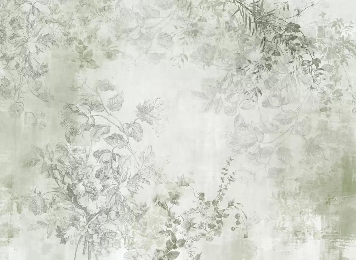 Zidne murale Vintage teksturirana cvjetna umjetnost s ilustracijama nježnog vrtnog cvijeća i lišća u stilu crtanja, meki zeleni tonovi br. w09402v2
