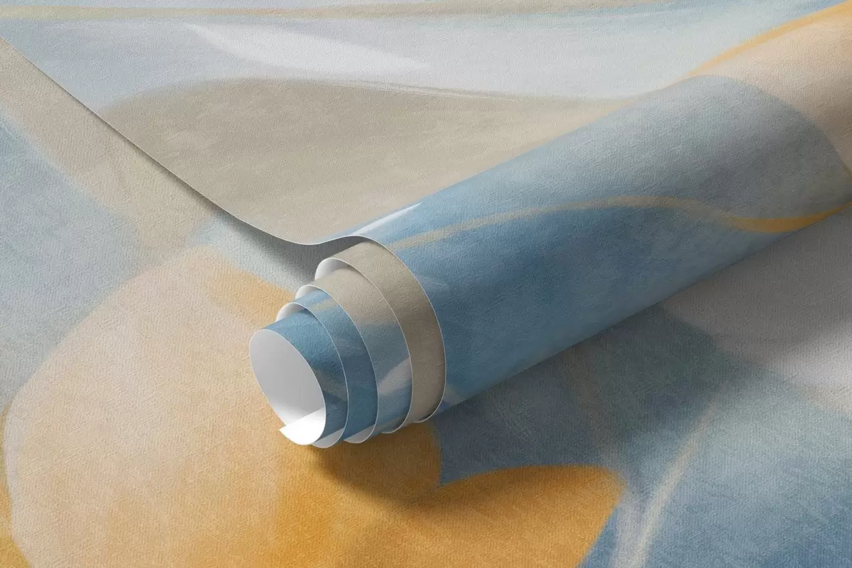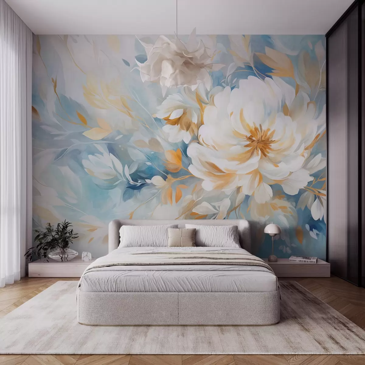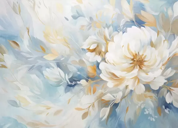 Zidne murale Teksturirani bijeli cvijet s plavim i žutim detaljima i lišćem na plavo-bijeloj apstraktnoj pozadini, stil slikanja br. w09403