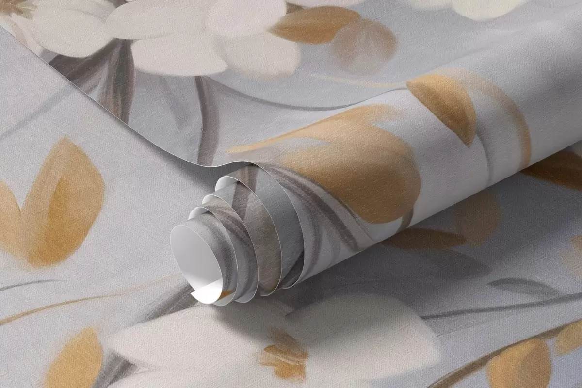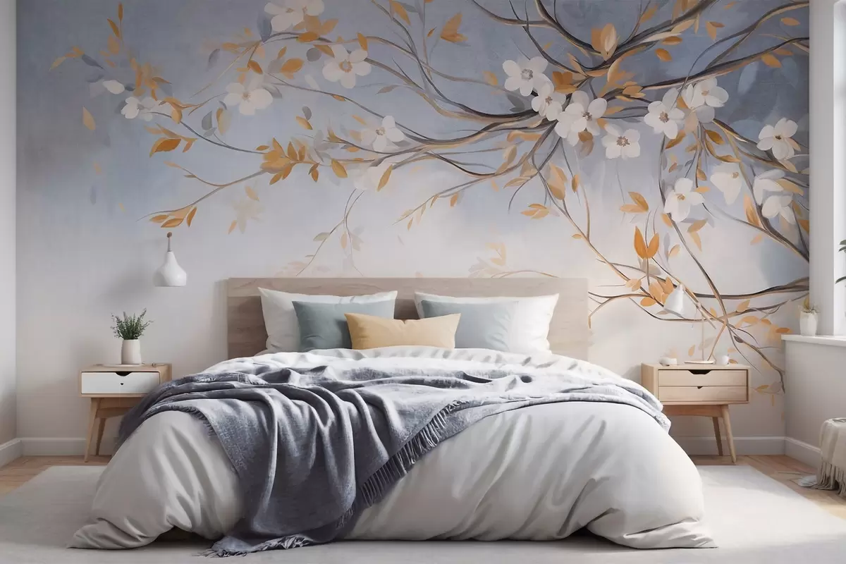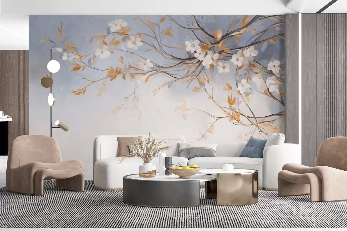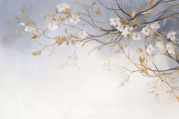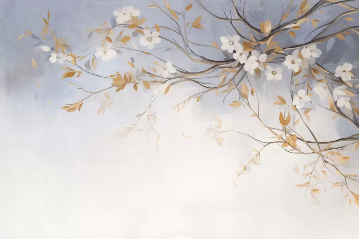 Zidne murale Bijelo cvijeće s narančastim lišćem na grani drveta, svijetloplava teksturirana pozadina, nježni potezi kistom br. w09415