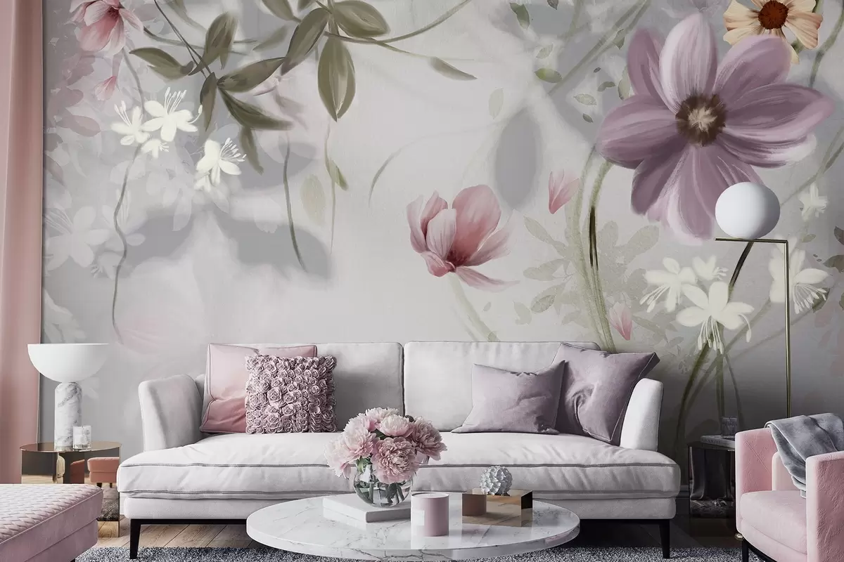 Zidne murale Ružičasto i bijelo cvijeće sa zelenim stabljikama i listovima, mekana rasvjeta, prigušene boje, cvjetni aranžman br. w09417v1