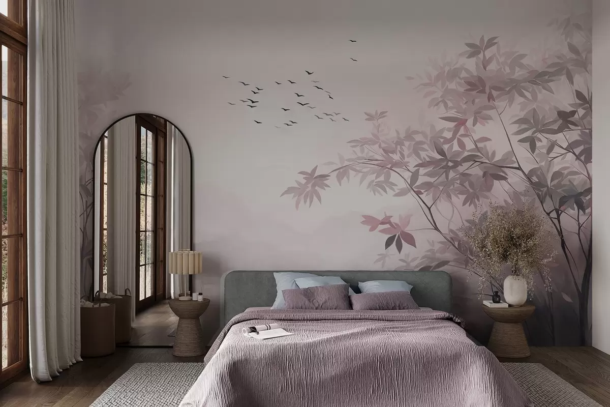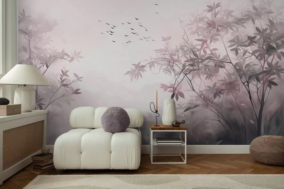 zidne murale Teksturirani krajolik s drvećem i jatom ptica koje lete nebom, pastelne boje, prirodni prizor w09418v1