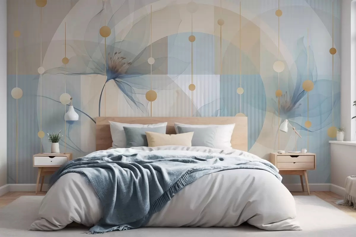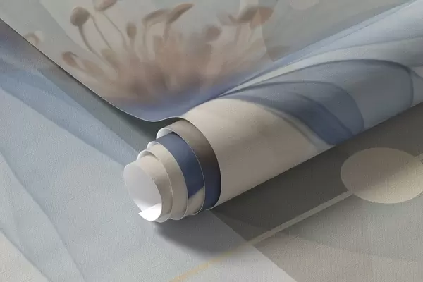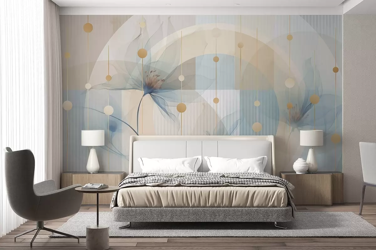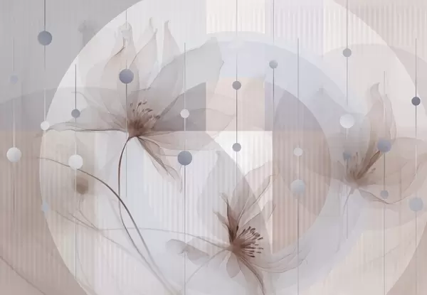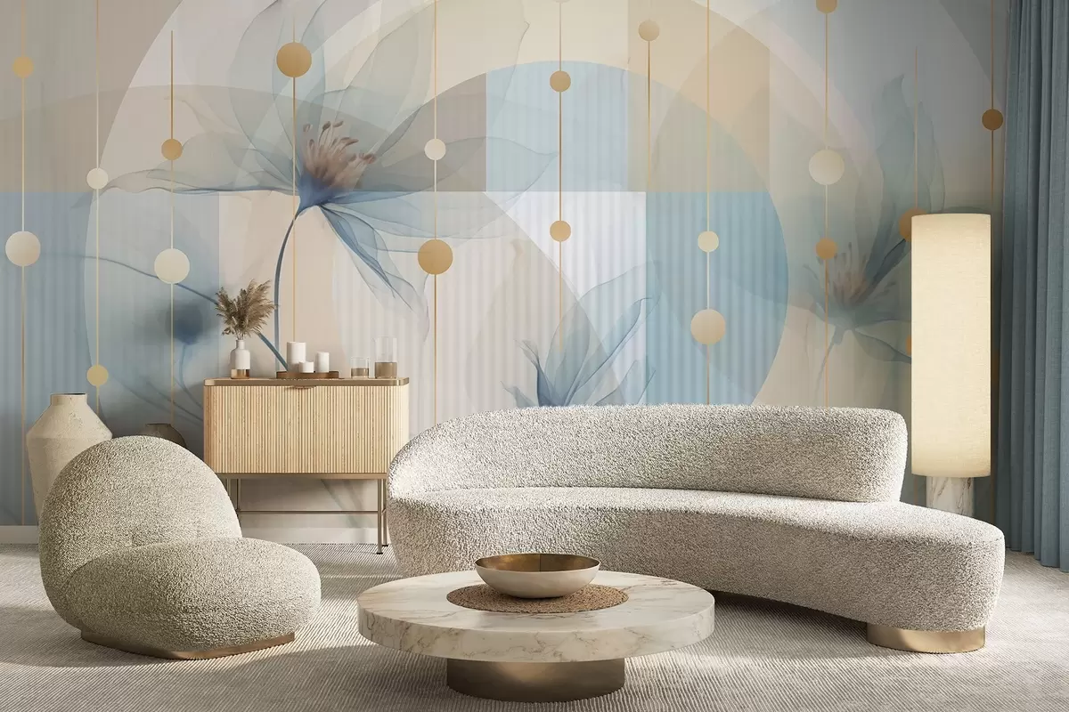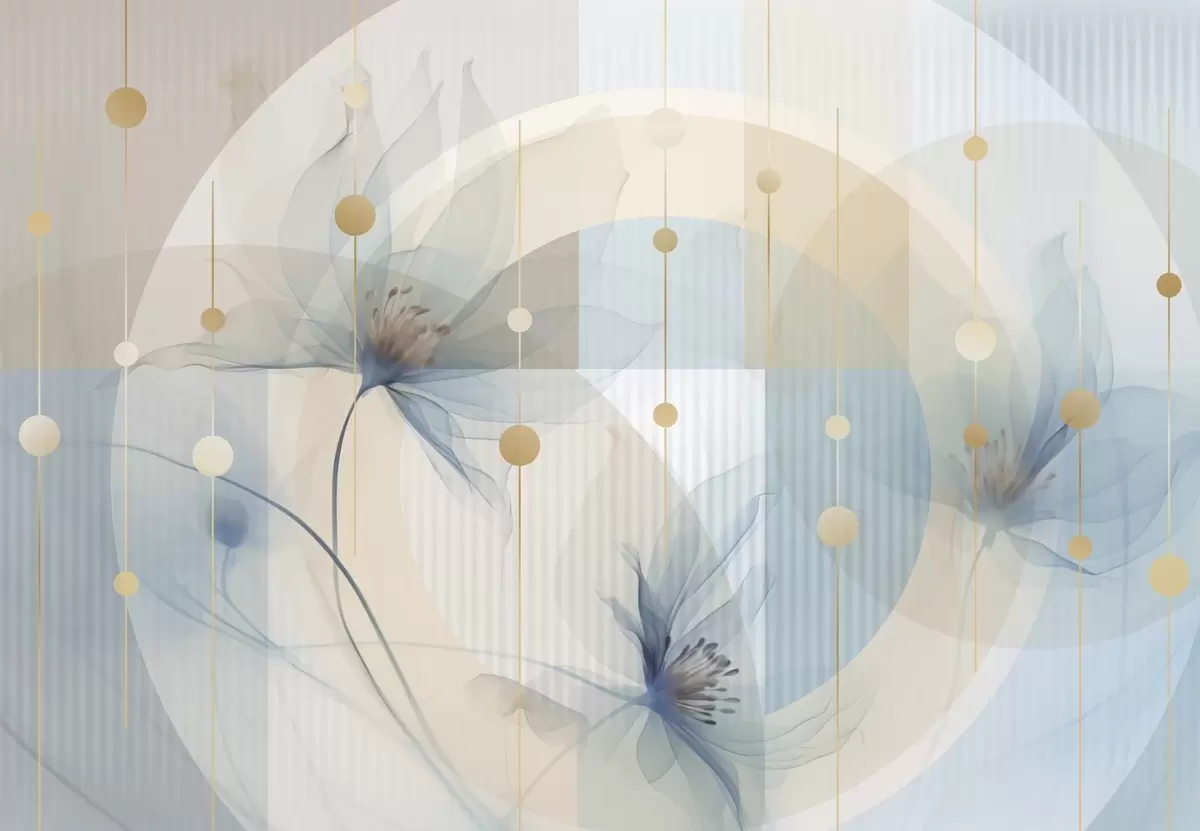 Zidne murale Apstraktno prozirno cvijeće, krugovi i geometrijski oblici, pastelno plava, bež i bijela paleta boja br. w09419