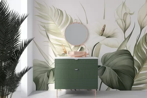 Zidne murale Bijele kale i zeleno tropsko lišće, botanička ilustracija, svijetla pozadina, vintage stil, teksturirano br. w09423