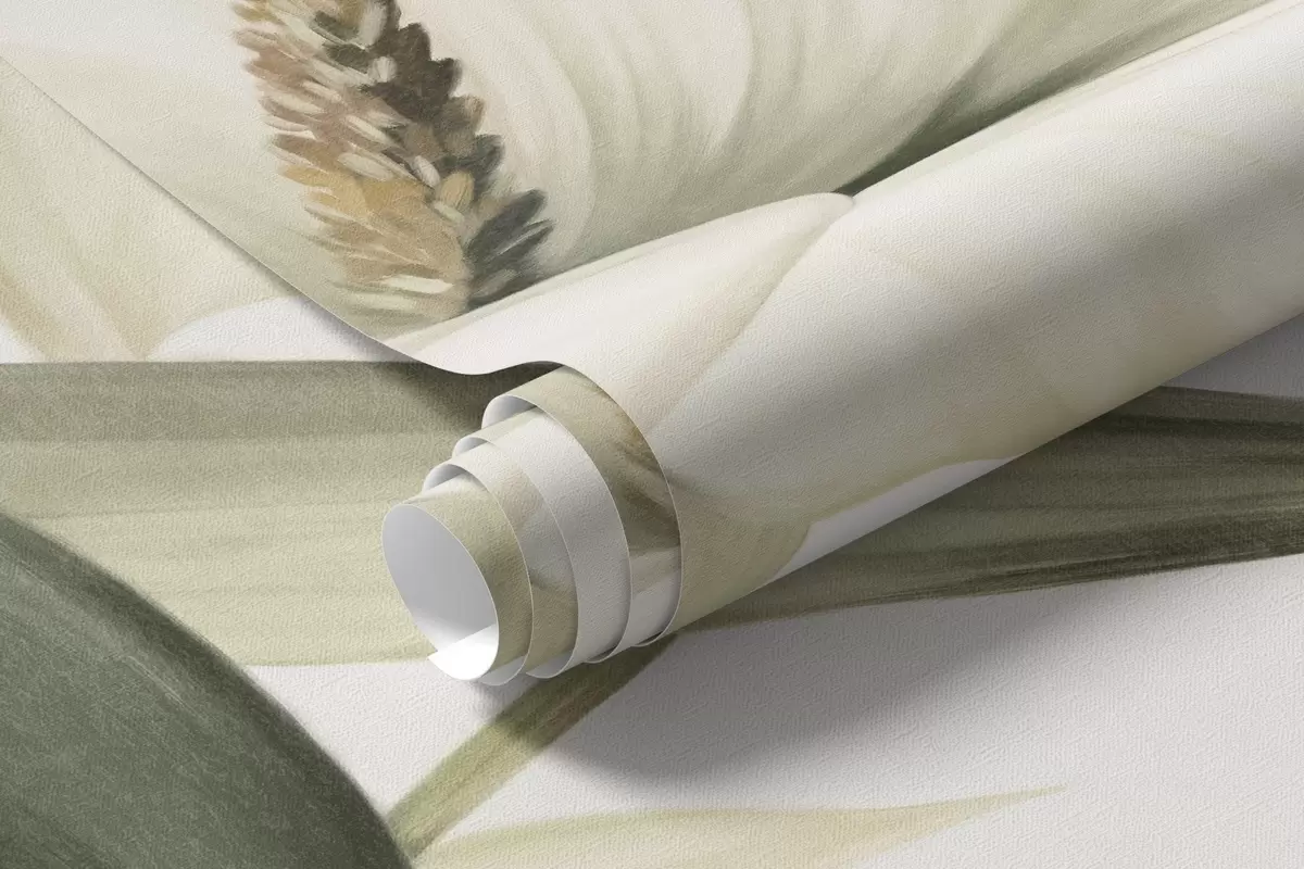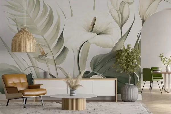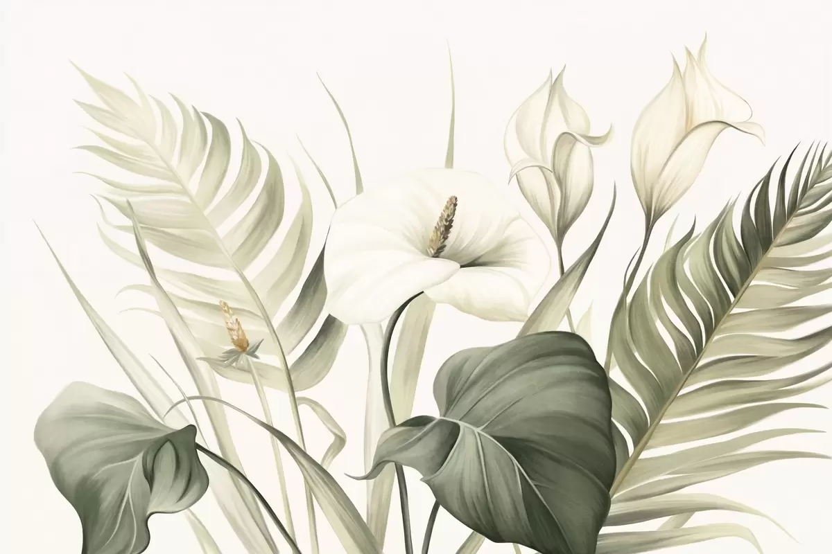 zidne murale Bijele kale i zeleno tropsko lišće, botanička ilustracija, svijetla pozadina, vintage stil, teksturirano w09423
