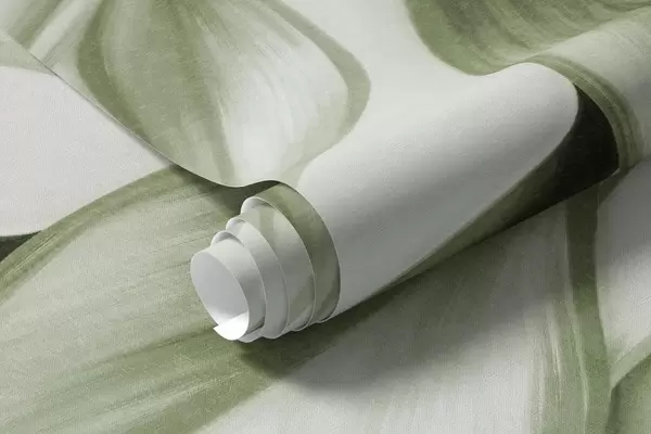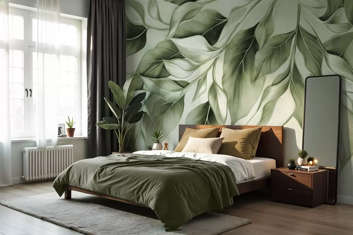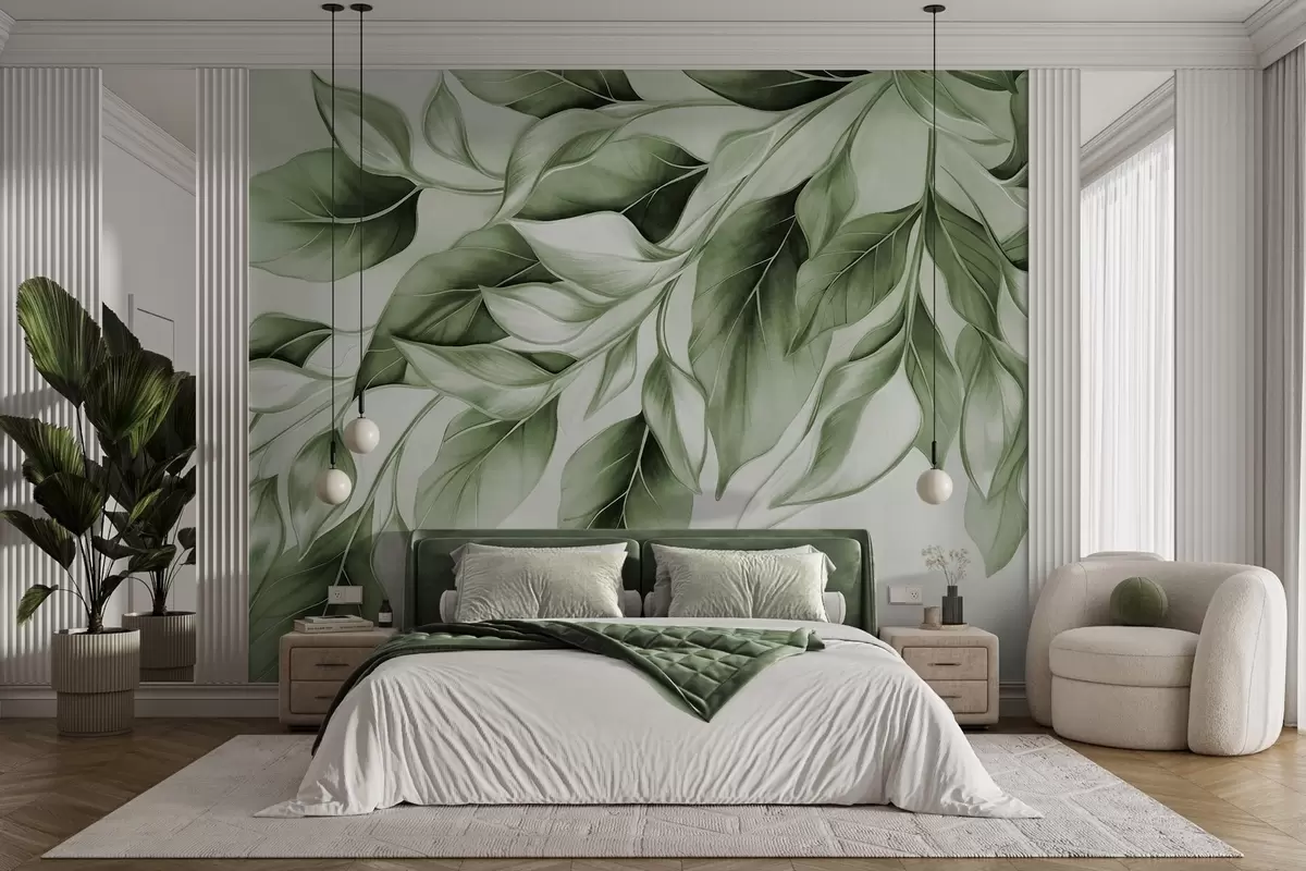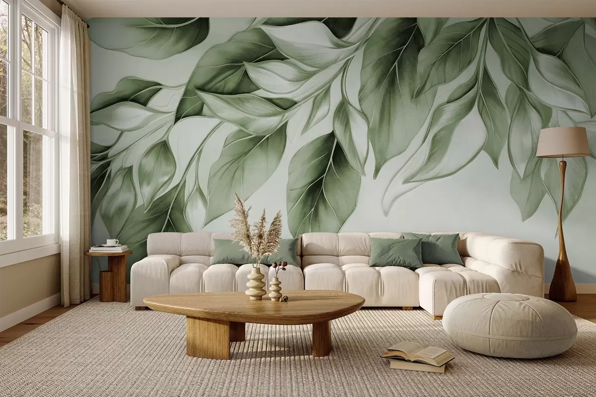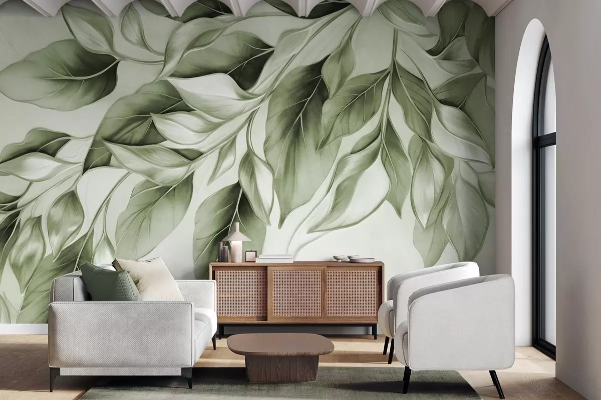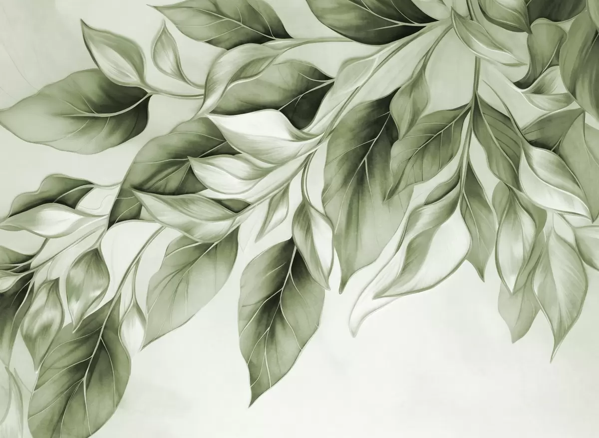 Zidne murale Teksturirano prigušeno zeleno lišće, svijetla pozadina, elegantan i umjetnički dizajn, moderan stil br. w09429v1