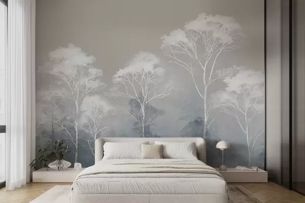 Zidne murale Minimalistička stabla u plavo-sivoj paleti, u magli br. w09448