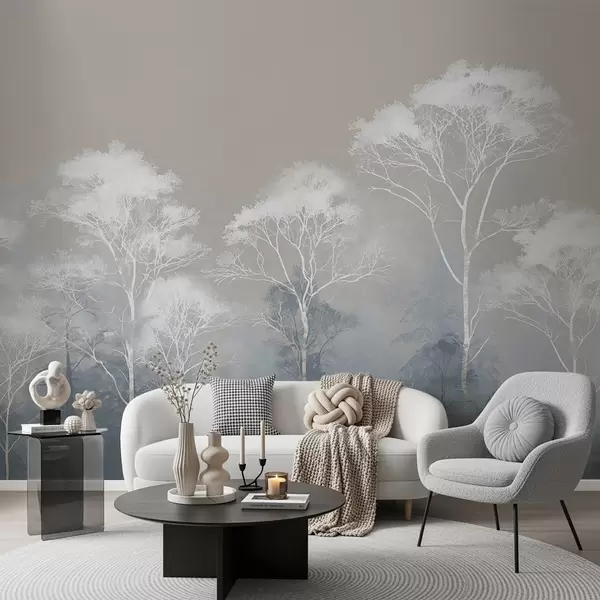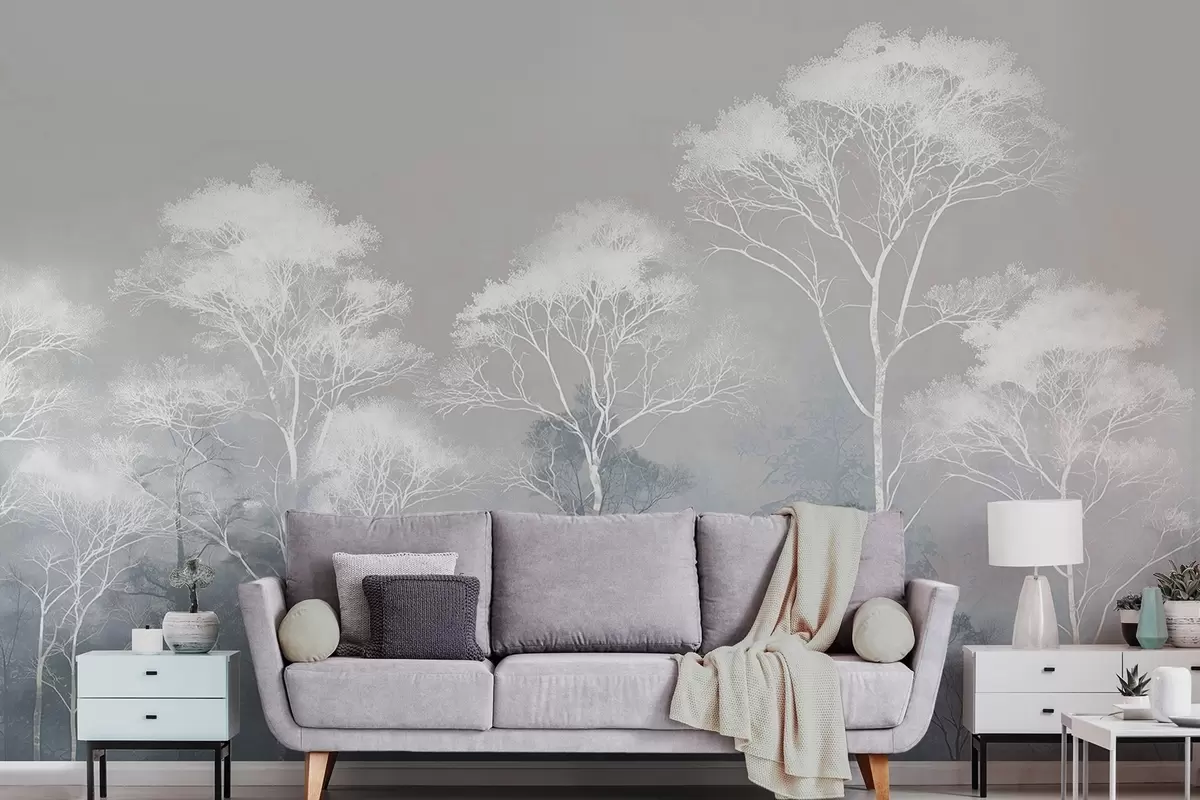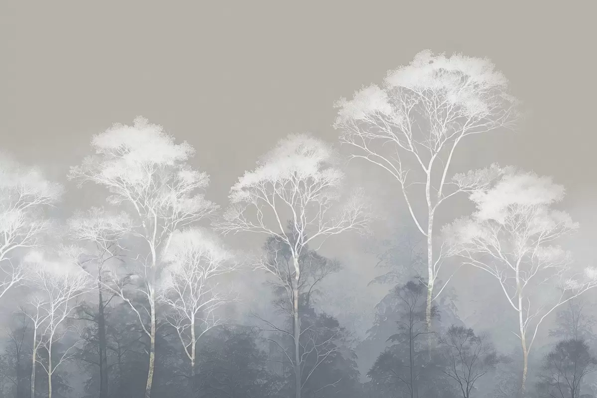 Zidne murale Minimalistička stabla u plavo-sivoj paleti, u magli br. w09448