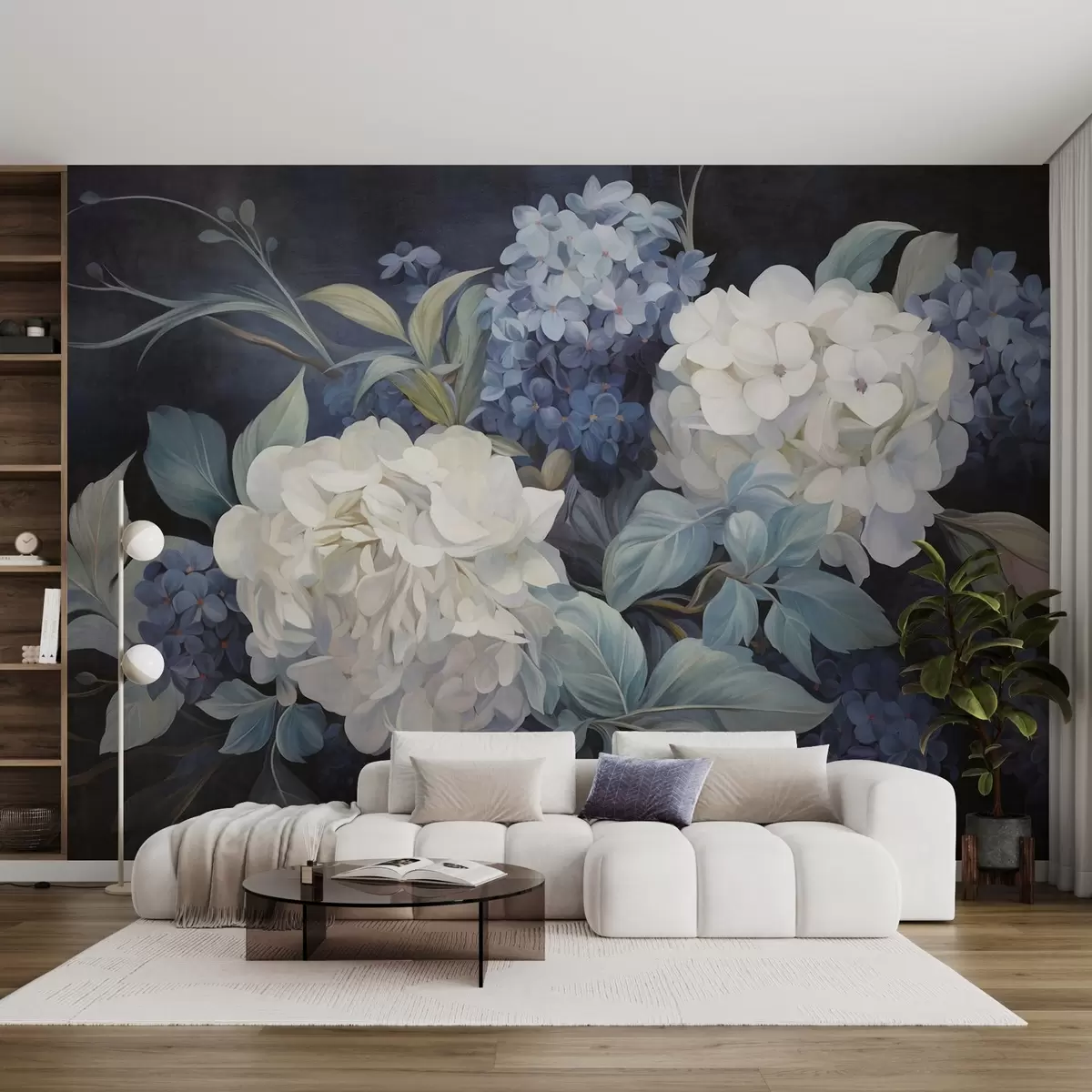 Zidne murale Teksturirana tamnoplava slika imitacije cvjetova hortenzije s velikim listovima, apstraktna i tamna pozadina br. w09465v1
