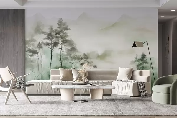 Zidne murale Magloviti krajolik s visokim drvećem i planinama prigušenih zelenih i sivih tonova, minimalistički stil, teksturiran br. w09469