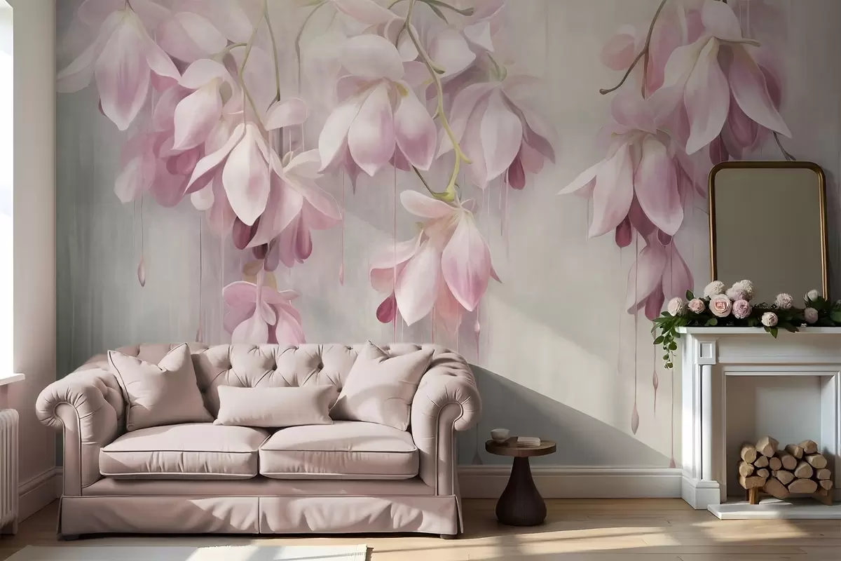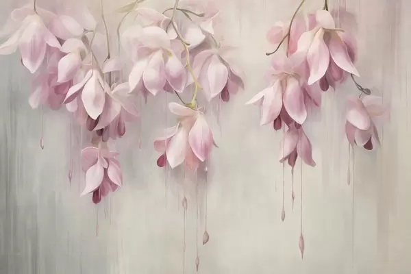 Zidne murale Viseće ružičasto cvijeće, svijetlosiva pozadina, cvjetni teksturirani aranžman, botanička umjetnost, pastelne boje br. w09471