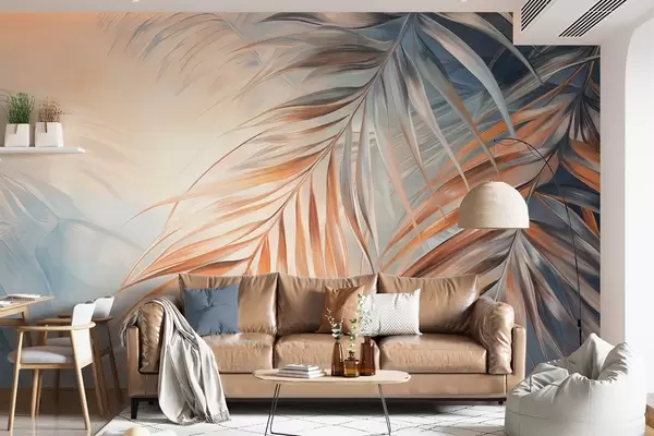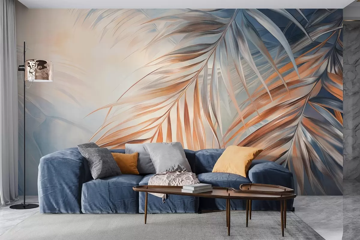 Zidne murale Palmino lišće s narančastim i plavim tonovima, svijetla teksturirana pozadina s mekim bojama, elegantan tropski stil br. w09475