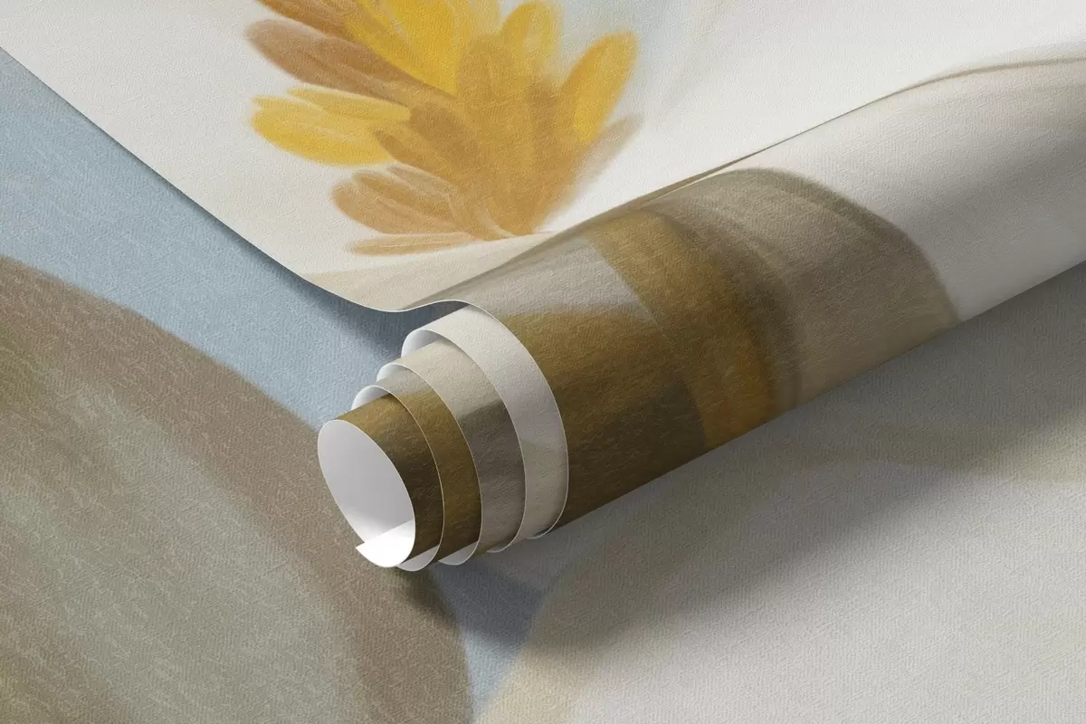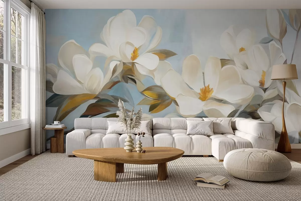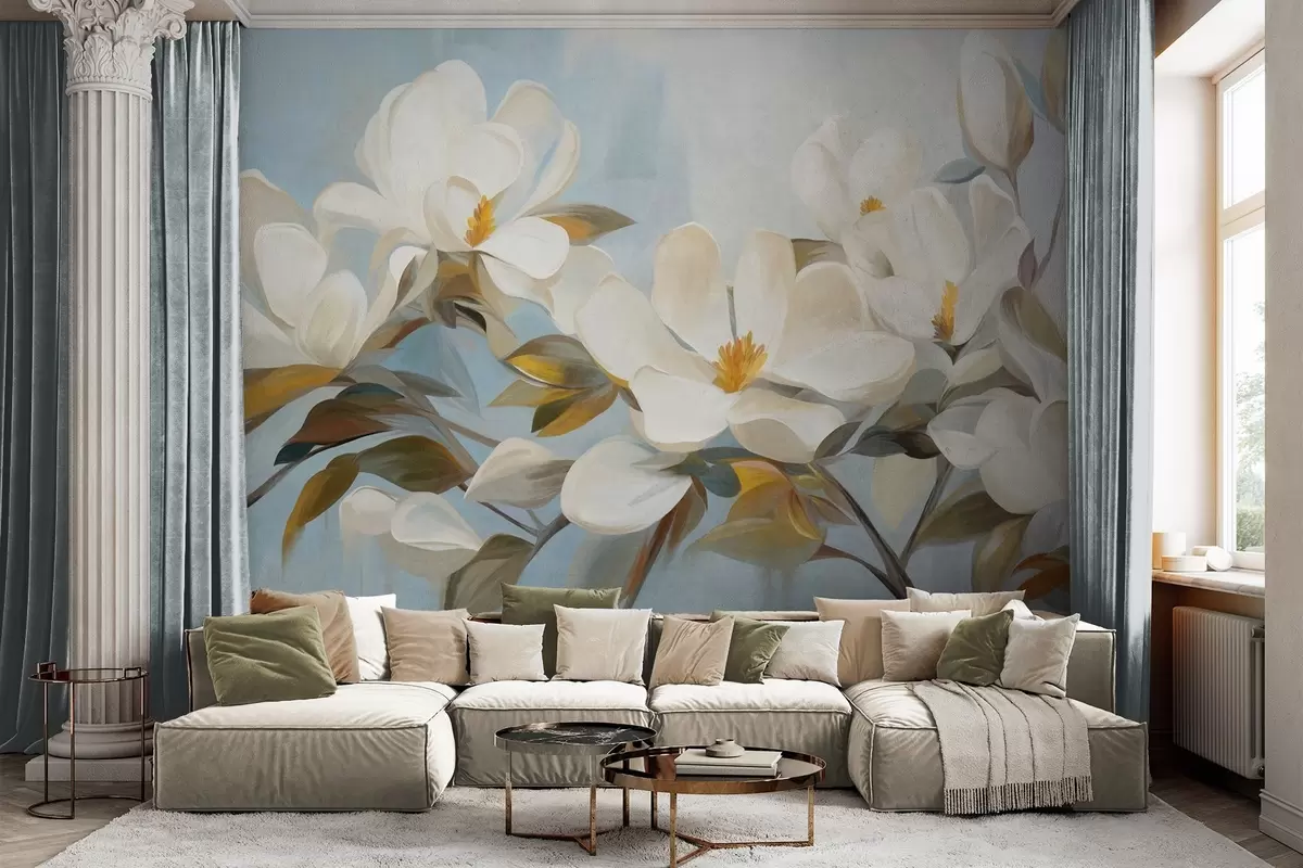 Zidne murale Bijele magnolije sa zelenim lišćem na svijetloplavoj pozadini s imitacijom apstraktnih poteza kistom br. w09478