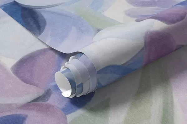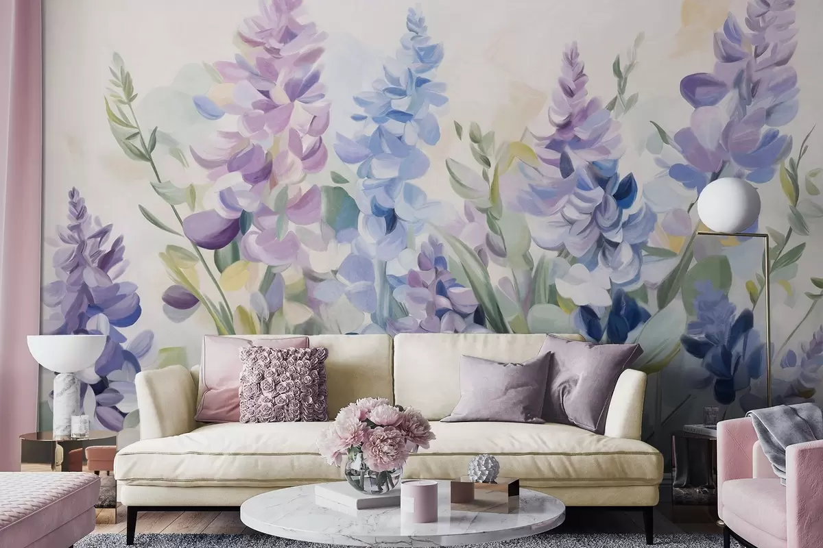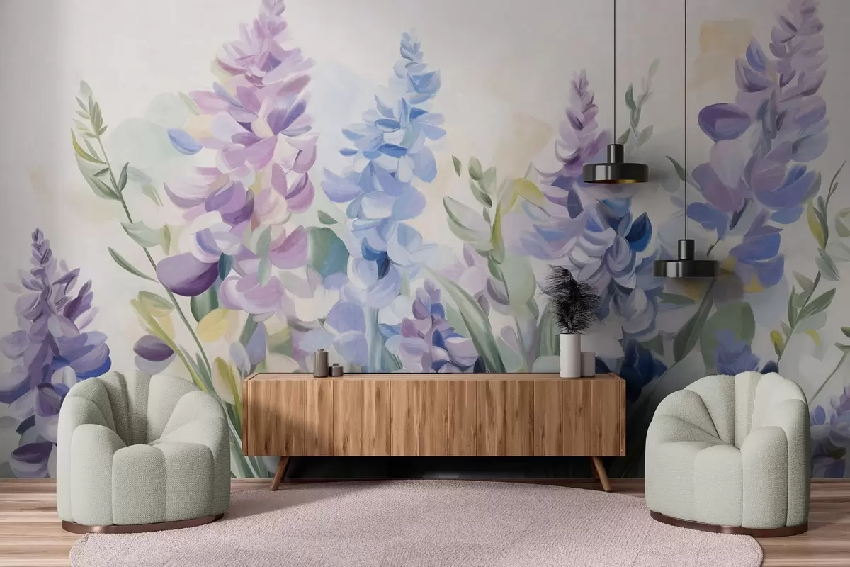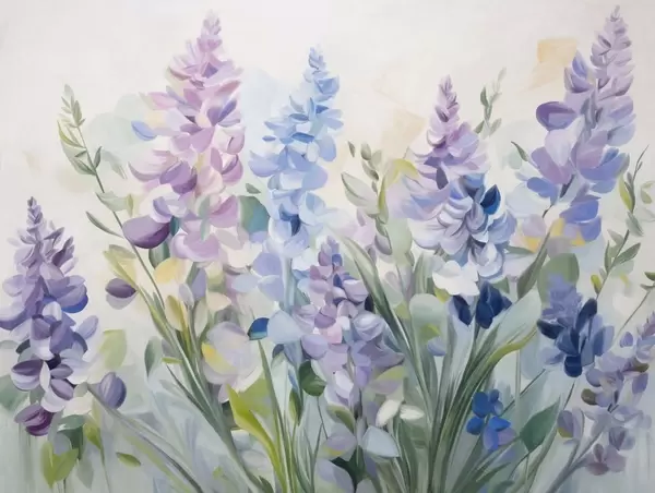 Zidne murale Ljubičasto i plavo teksturirano cvijeće s plavim lišćem, svijetla pozadina, meki potezi kistom, žive boje br. w09482