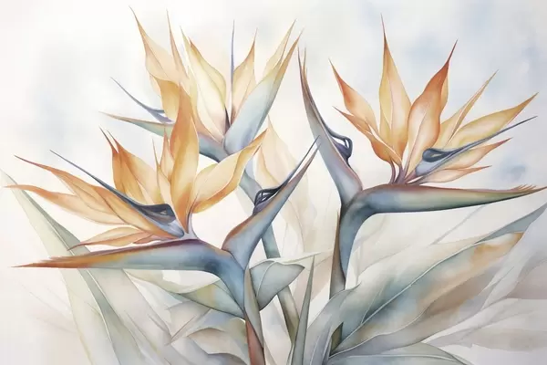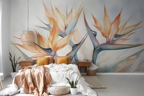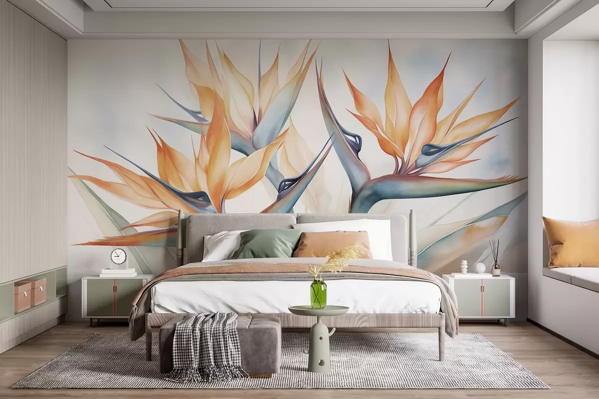Zidne murale Cvijet rajske ptice, strelicija s narančastim laticama, mekani teksturirani stil akvarela, svijetla pozadina br. w09483