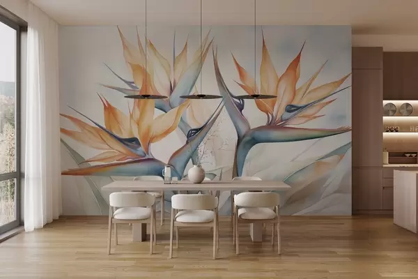 Zidne murale Cvijet rajske ptice, strelicija s narančastim laticama, mekani teksturirani stil akvarela, svijetla pozadina br. w09483