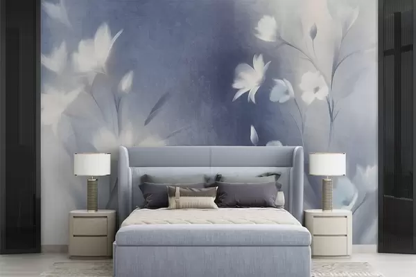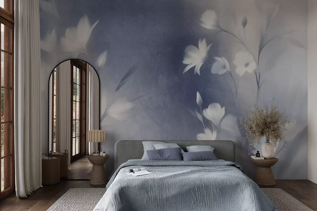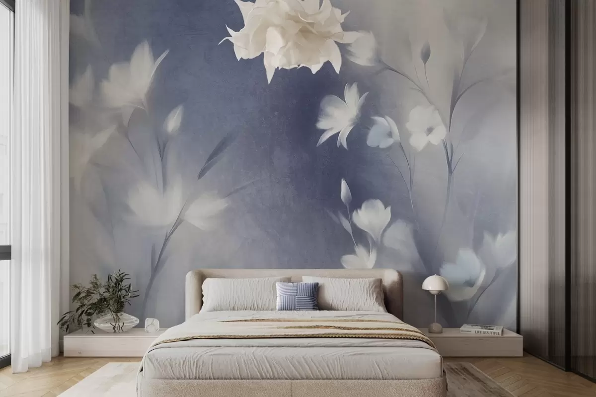 Zidne murale Bijeli teksturirani cvjetovi s dugim stabljikama, meki pupoljci na zamućenoj pozadini plavih i bijelih nijansi br. w09484