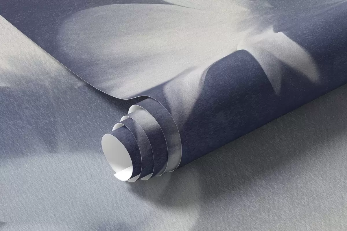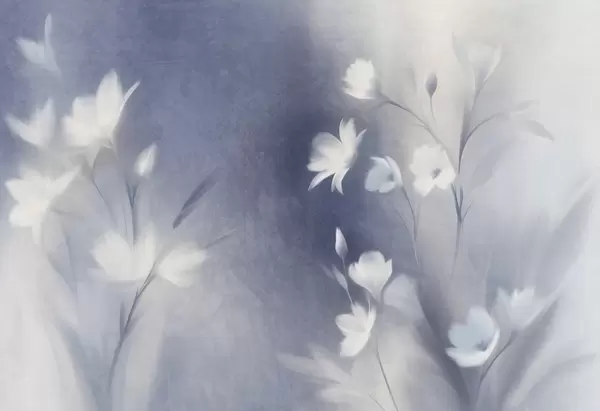 Zidne murale Bijeli teksturirani cvjetovi s dugim stabljikama, meki pupoljci na zamućenoj pozadini plavih i bijelih nijansi br. w09484