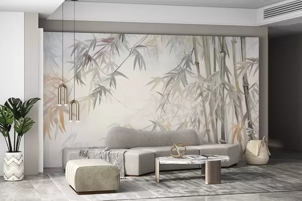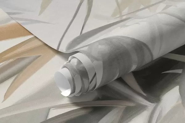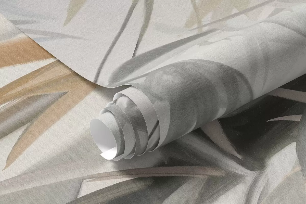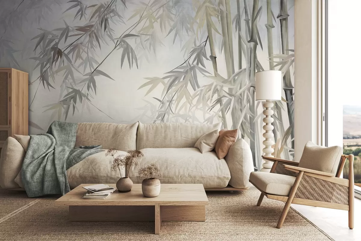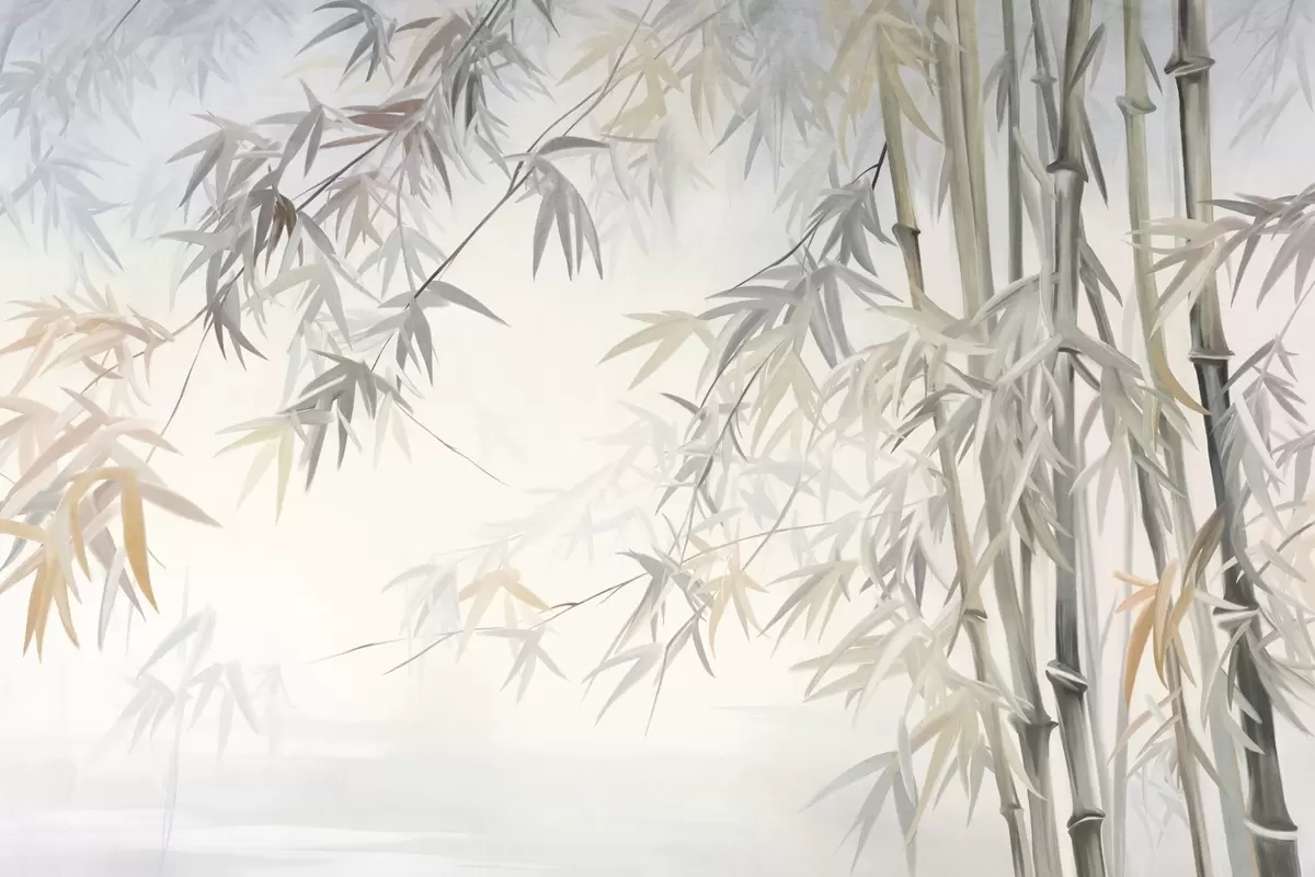 Zidne murale Teksturirane stabljike i listovi bambusa u mekoj, prigušenoj paleti boja sive, bijele i krem, minimalistička kompozicija br. w09485