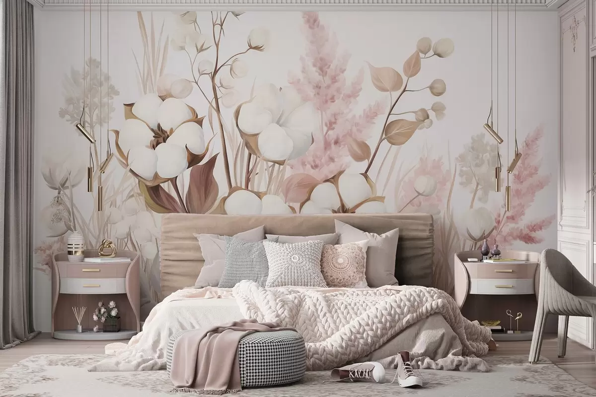 Zidne murale Cvijeće teksturirane pamukom s bijelom i ružičastom pampas travom, bež i smeđim lišćem i biljem, bijela pozadina br. w09489