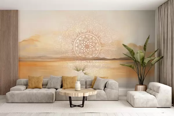 Zidne murale Teksturirani simetrični dizajn mandale koji prekriva krajolik s morem, brdima i nebom, meke pastelne boje br. w09491
