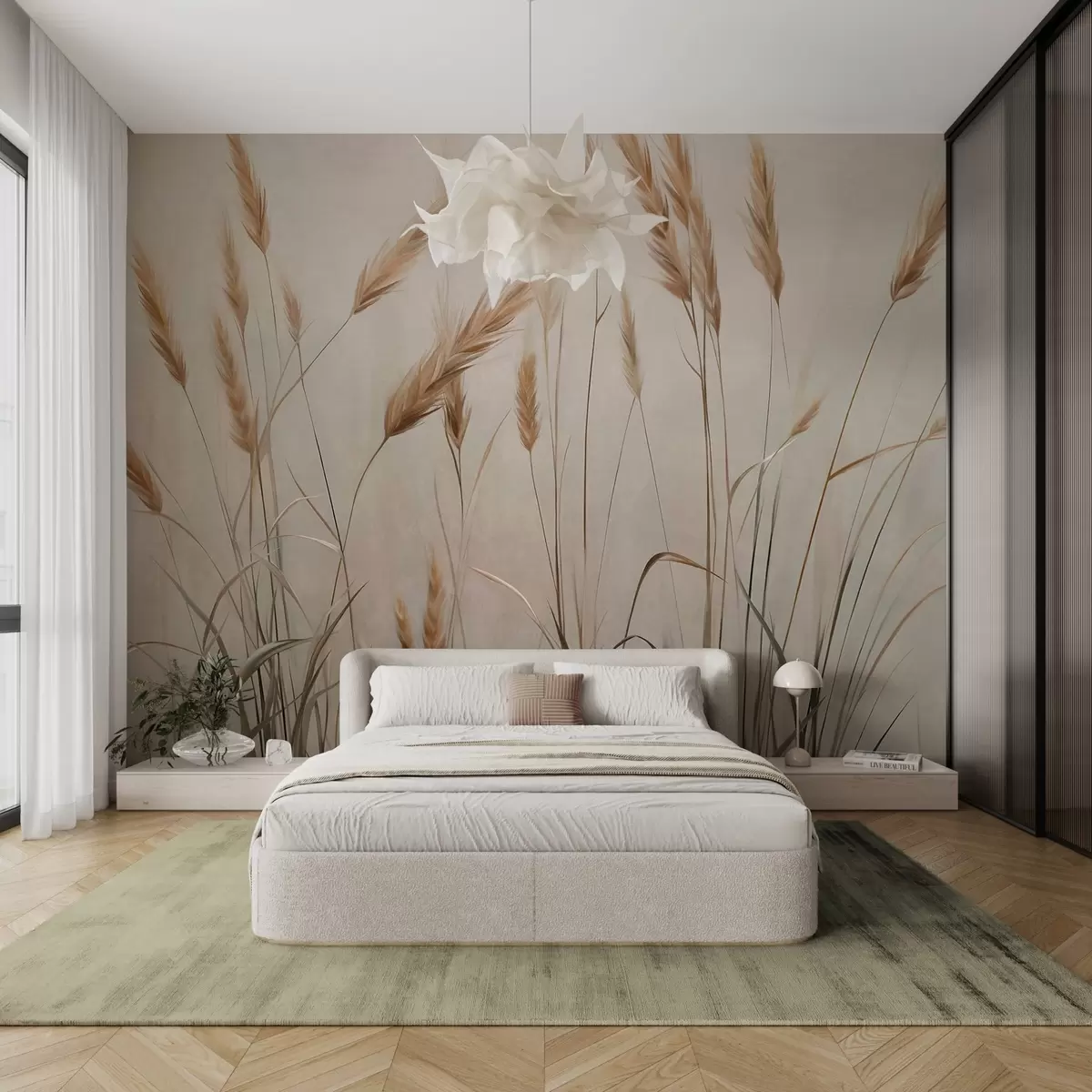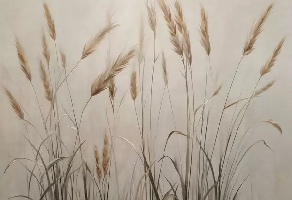 Zidne murale Pšenično teksturirano polje sa žutim klasjem žita, bež pozadina, prirodno osvjetljenje, topli tonovi, detaljni potezi kistom br. w09493