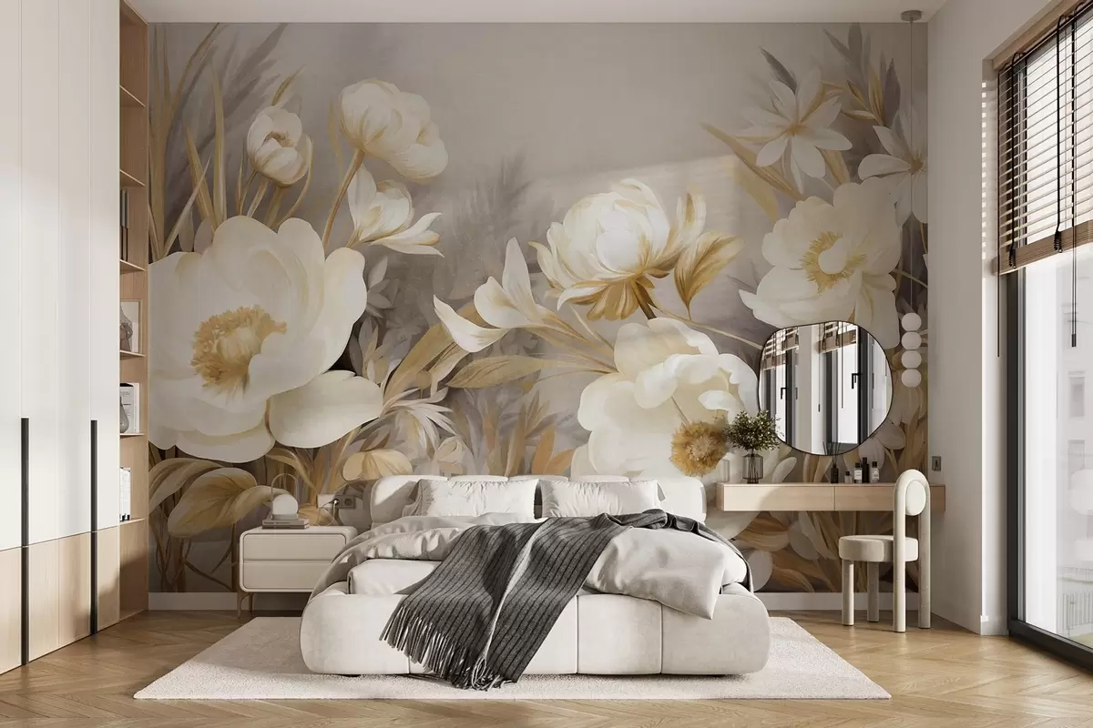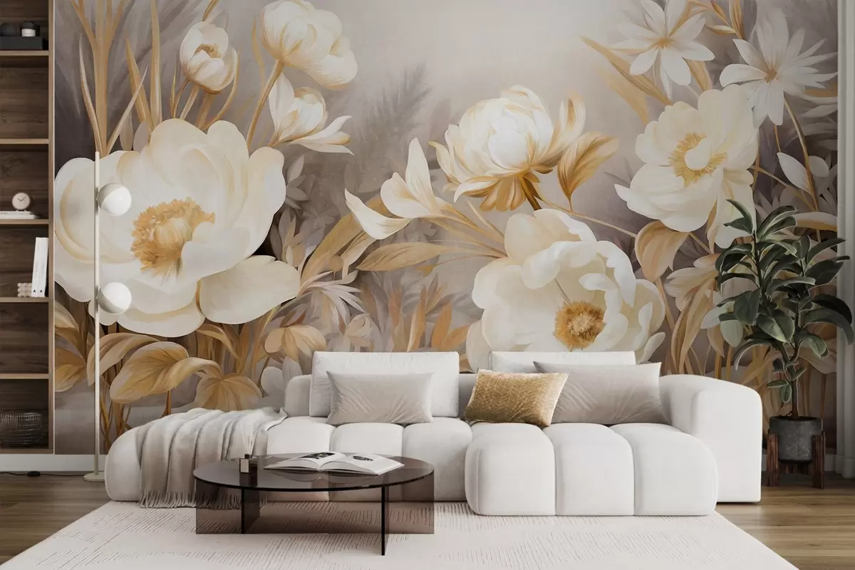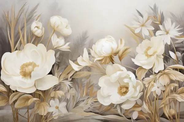 Zidne murale Bijeli i žuti božuri i ostalo cvijeće s visokom travom i lišćem u mekom, slikarski teksturiranom stilu br. w09494