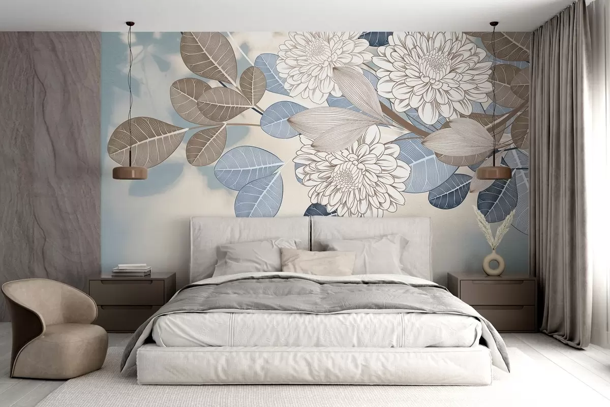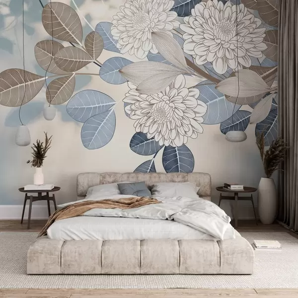 Zidne murale Bijelo cvijeće s plavim i smeđim lišćem, svijetloplava teksturirana pozadina, cvjetni aranžman, detaljna linijska umjetnost br. w09496