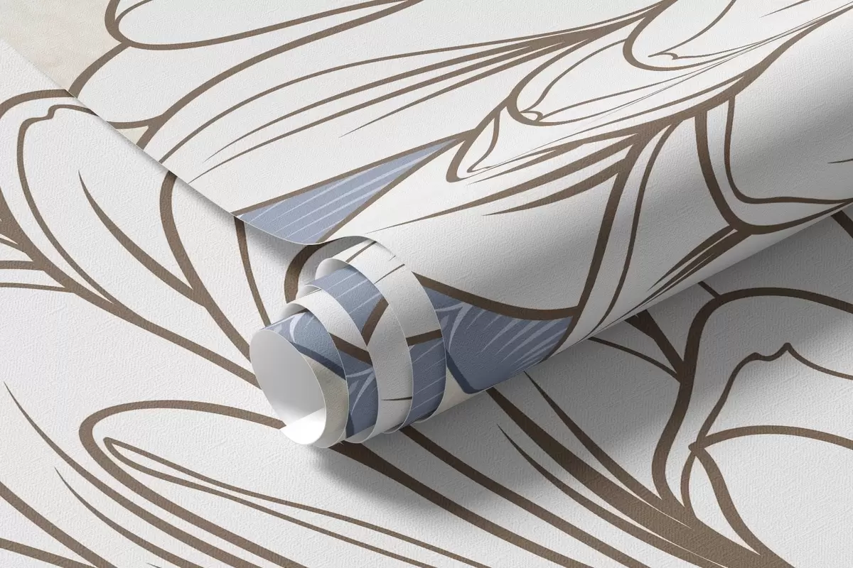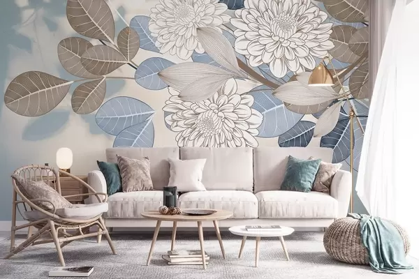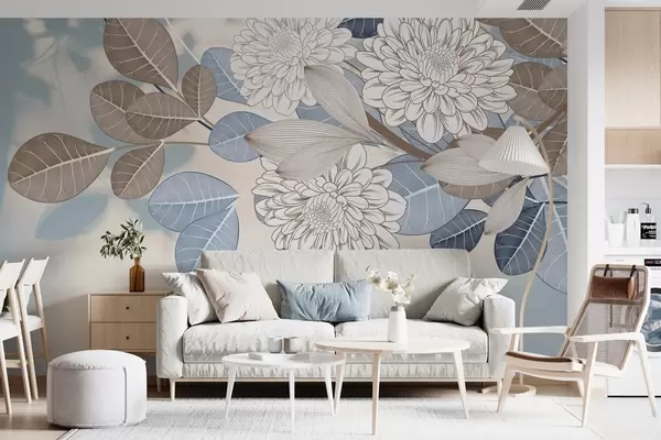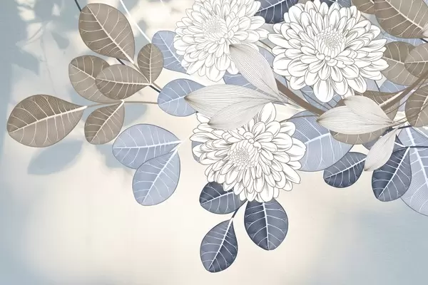 Zidne murale Bijelo cvijeće s plavim i smeđim lišćem, svijetloplava teksturirana pozadina, cvjetni aranžman, detaljna linijska umjetnost br. w09496