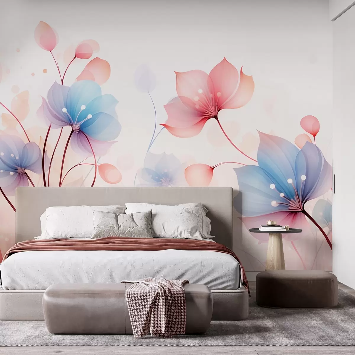 zidne murale Nježno ružičasto-plavo cvijeće - prozračna flora na bijeloj akvarelnoj pozadini w09507