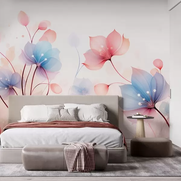 Zidne murale Nježno ružičasto-plavo cvijeće - prozračna flora na bijeloj akvarelnoj pozadini br. w09507