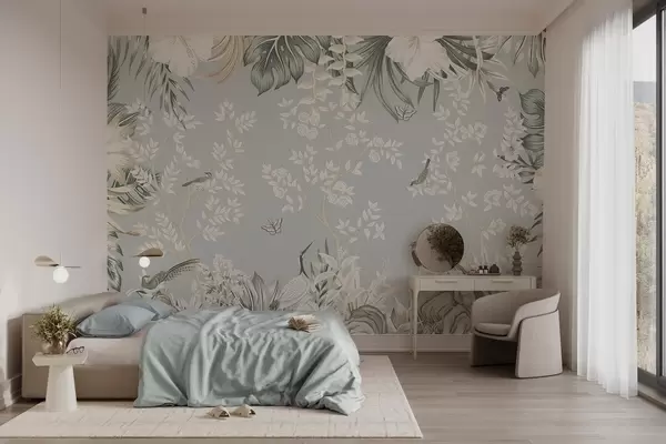 Zidne murale Tropska teksturirana pastelna umjetnost s pticama, leptirima, cvjetovima hibiskusa, palminim lišćem i drvećem na svijetloplavoj pozadini br. w09528