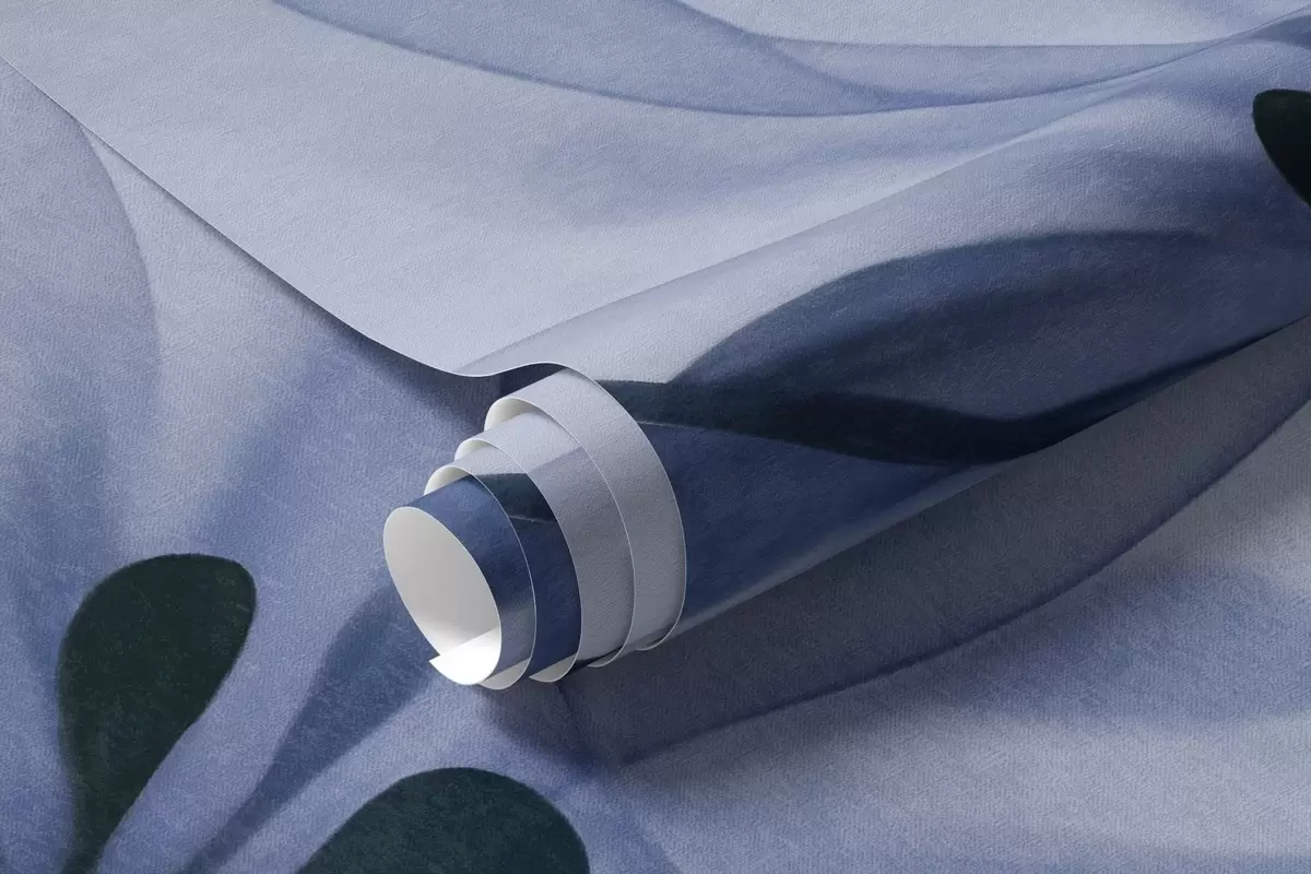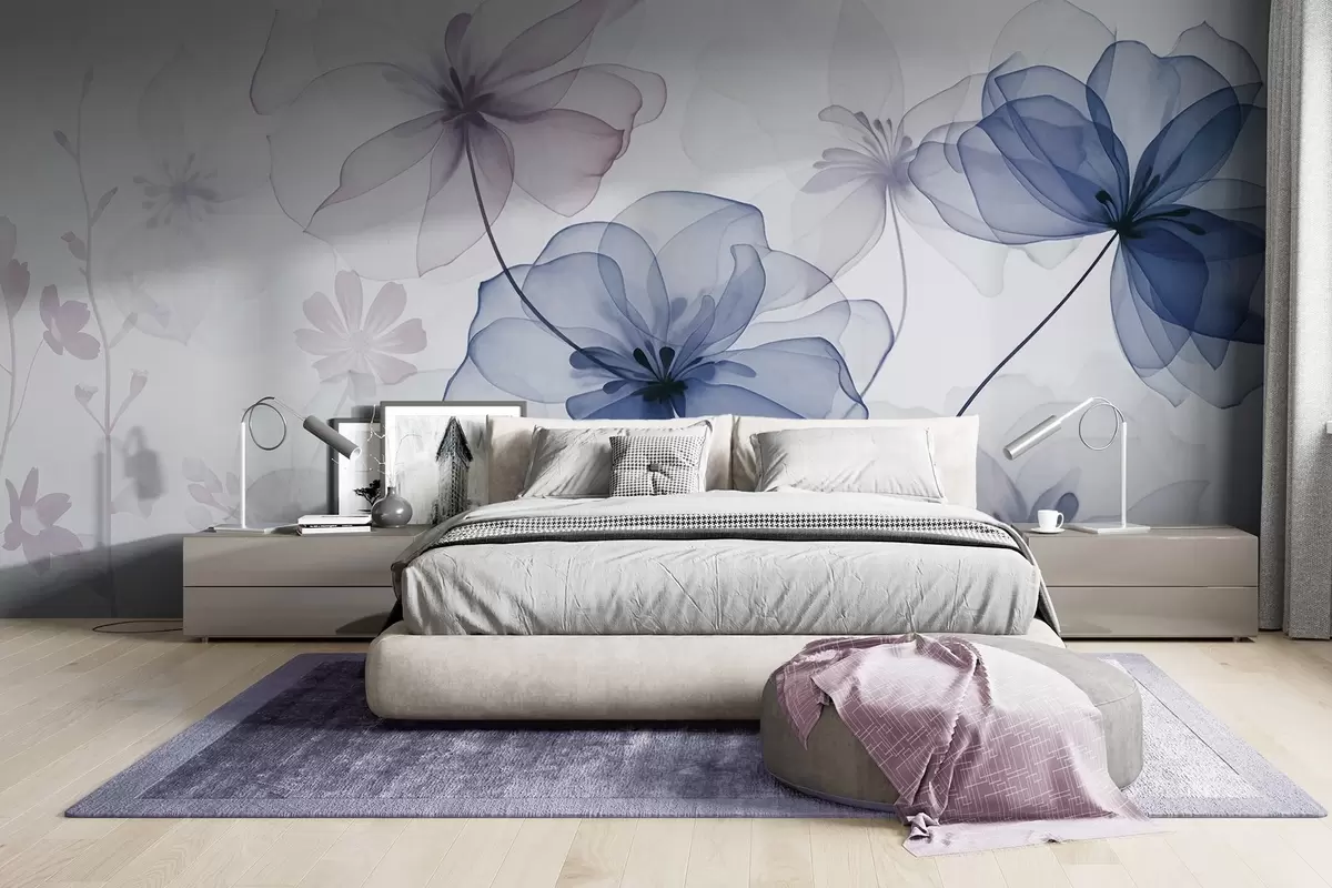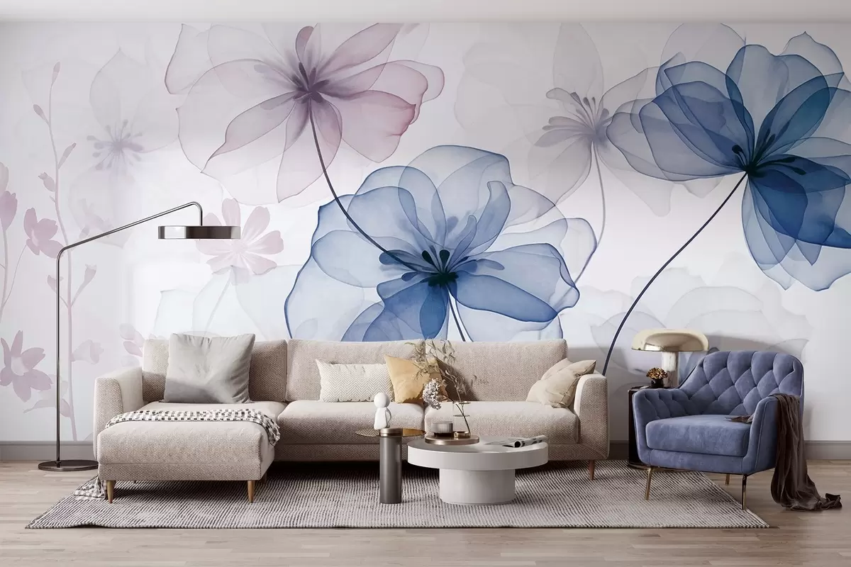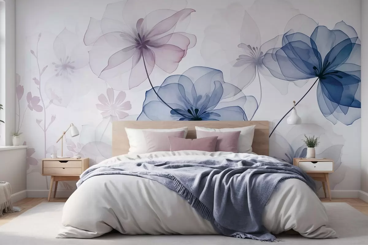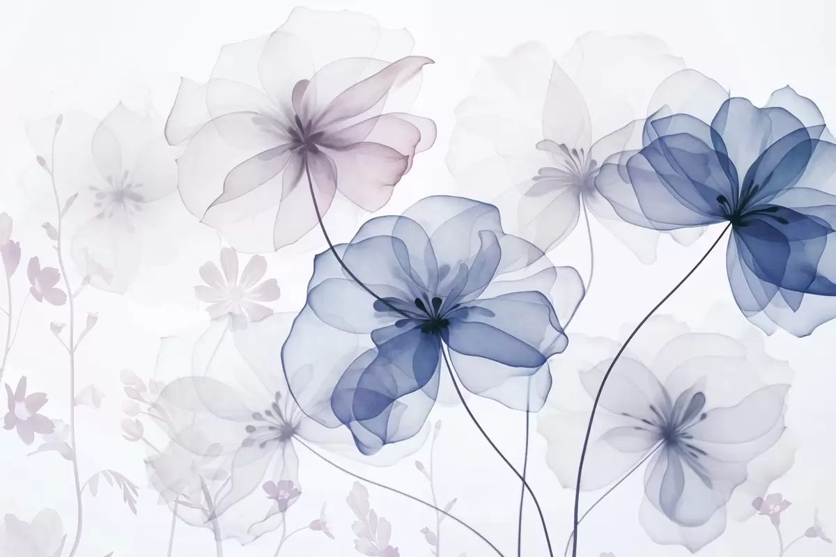 Zidne murale Prozirno cvijeće s prigušenim plavim i ružičastim laticama, dugim stabljikama, svijetlom pozadinom, mekim bojama, teksturiranim cvjetnim dizajnom br. w09529v1