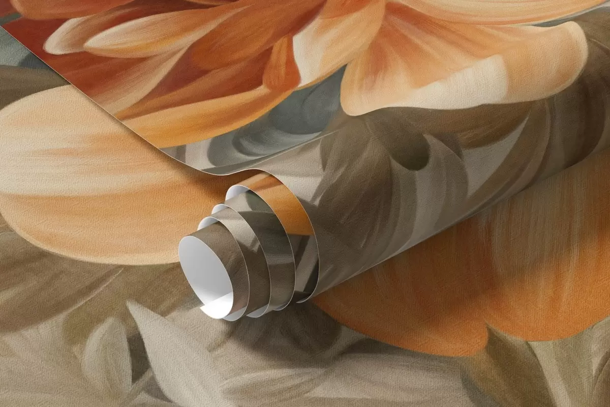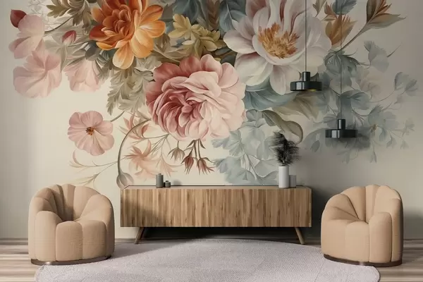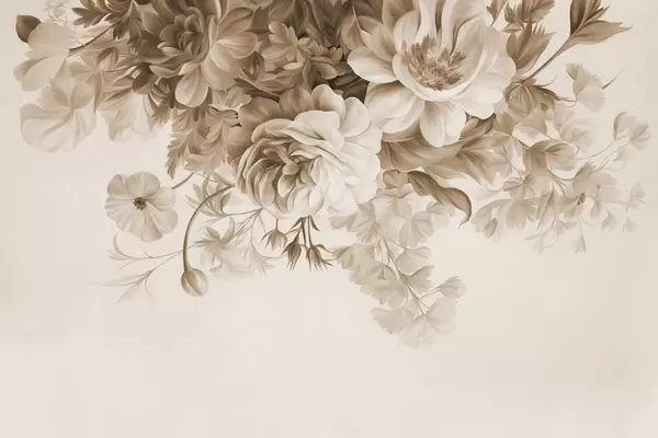 Zidne murale Vintage cvjetni aranžman s ružama, božurima i drugim teksturiranim cvijećem s lišćem, na svijetloj pozadini br. w09532