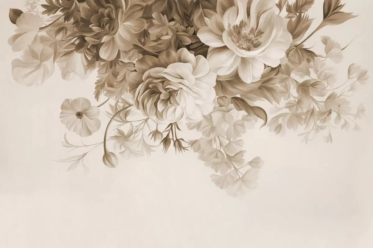 Zidne murale Vintage cvjetni aranžman s ružama, božurima i drugim teksturiranim cvijećem s lišćem, na svijetloj pozadini br. w09532v1