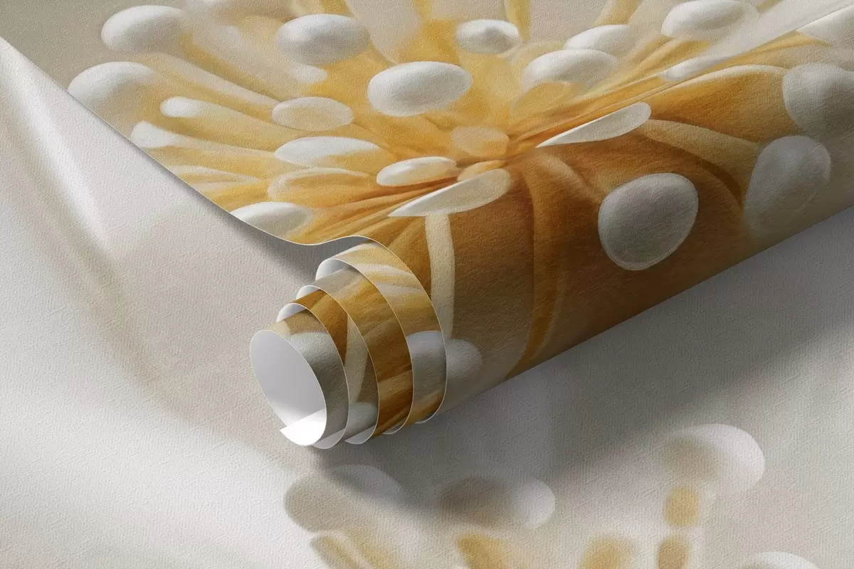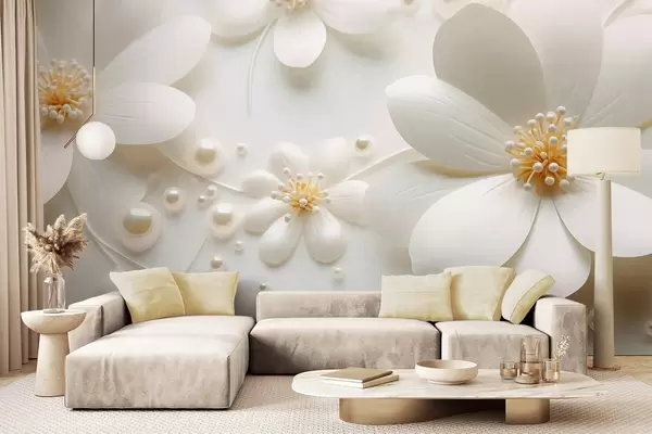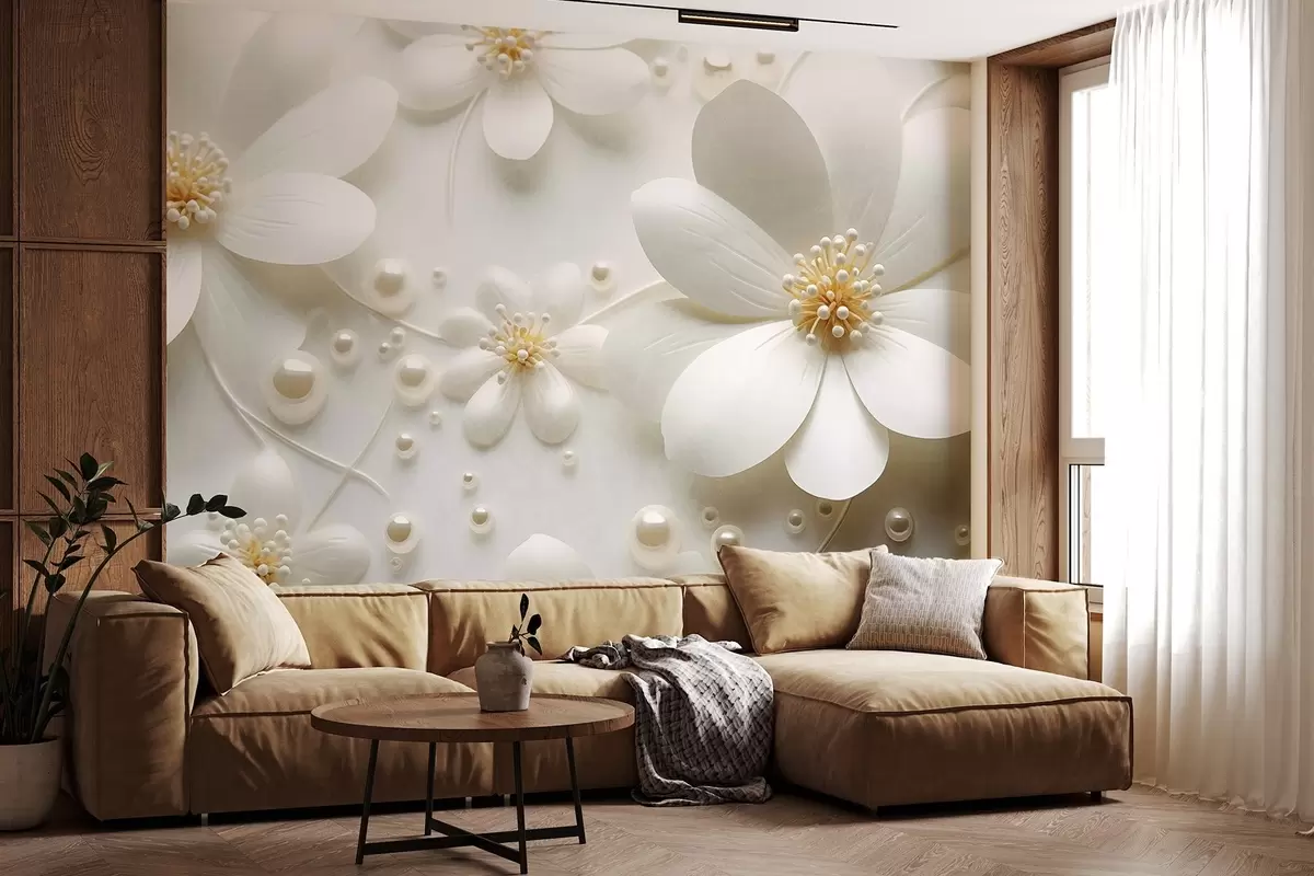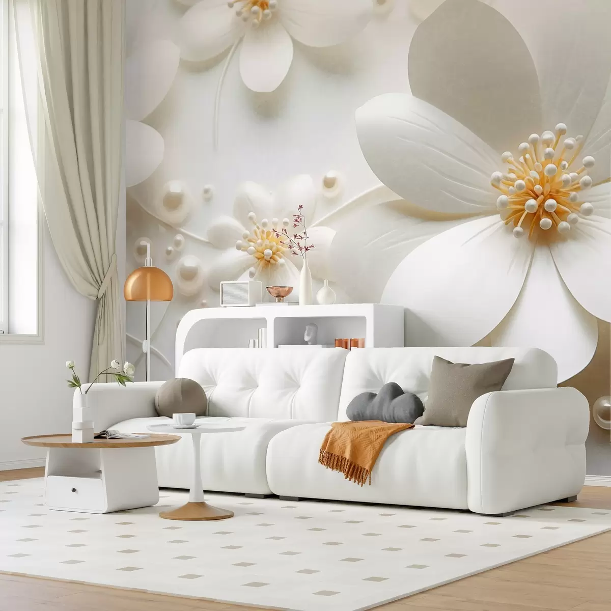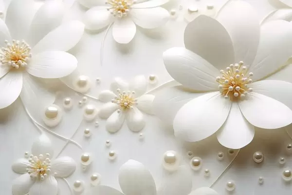 Zidne murale Bijelo cvijeće s biserima razasutim po bijeloj pozadini, elegantan i minimalistički dizajn, teksturirano br. w09535