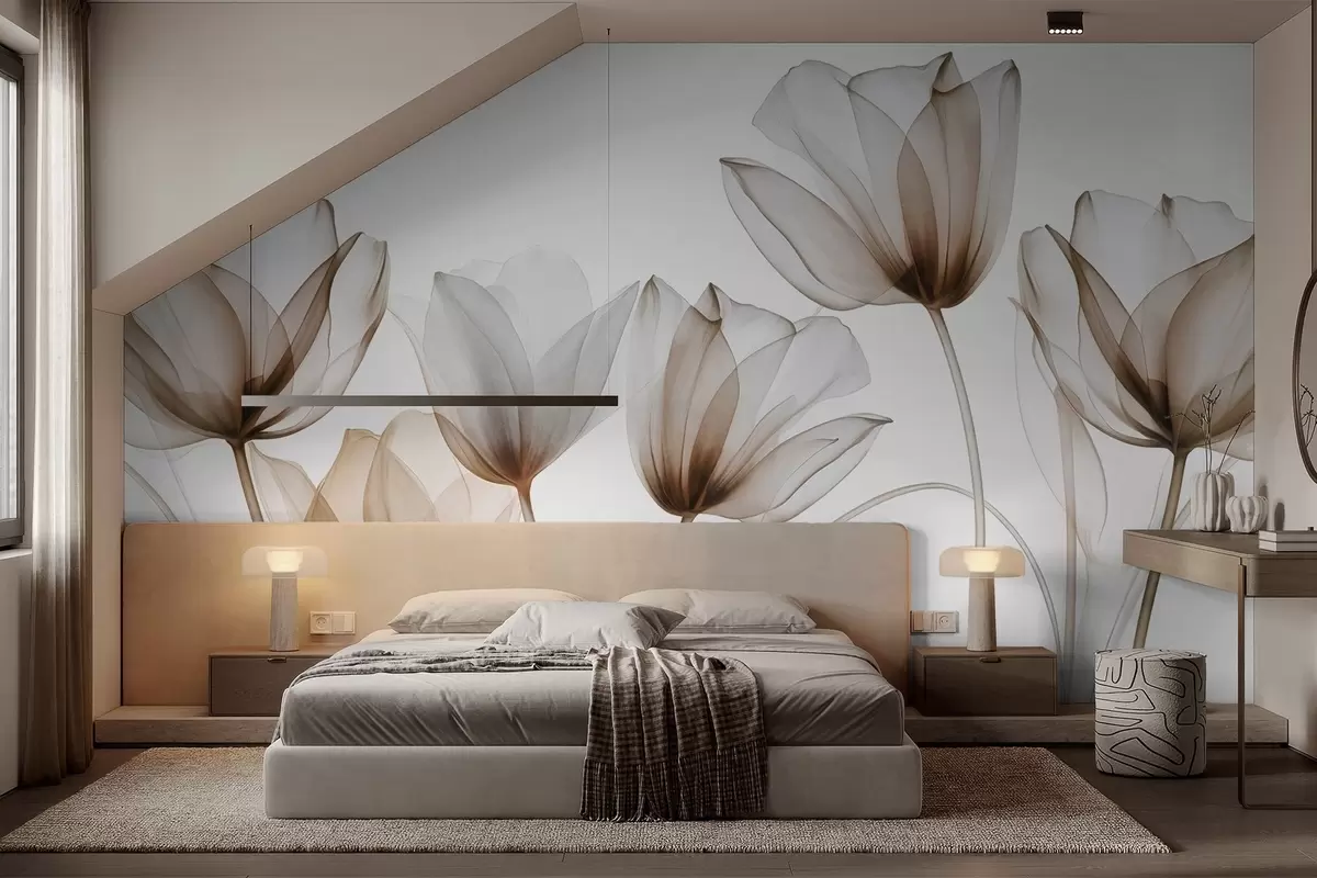Zidne murale Prozirni smeđi i bijeli cvjetovi tulipana s dugim stabljikama, na svijetloj pozadini, nježna i teksturirana cvjetna umjetnost br. w09538v1
